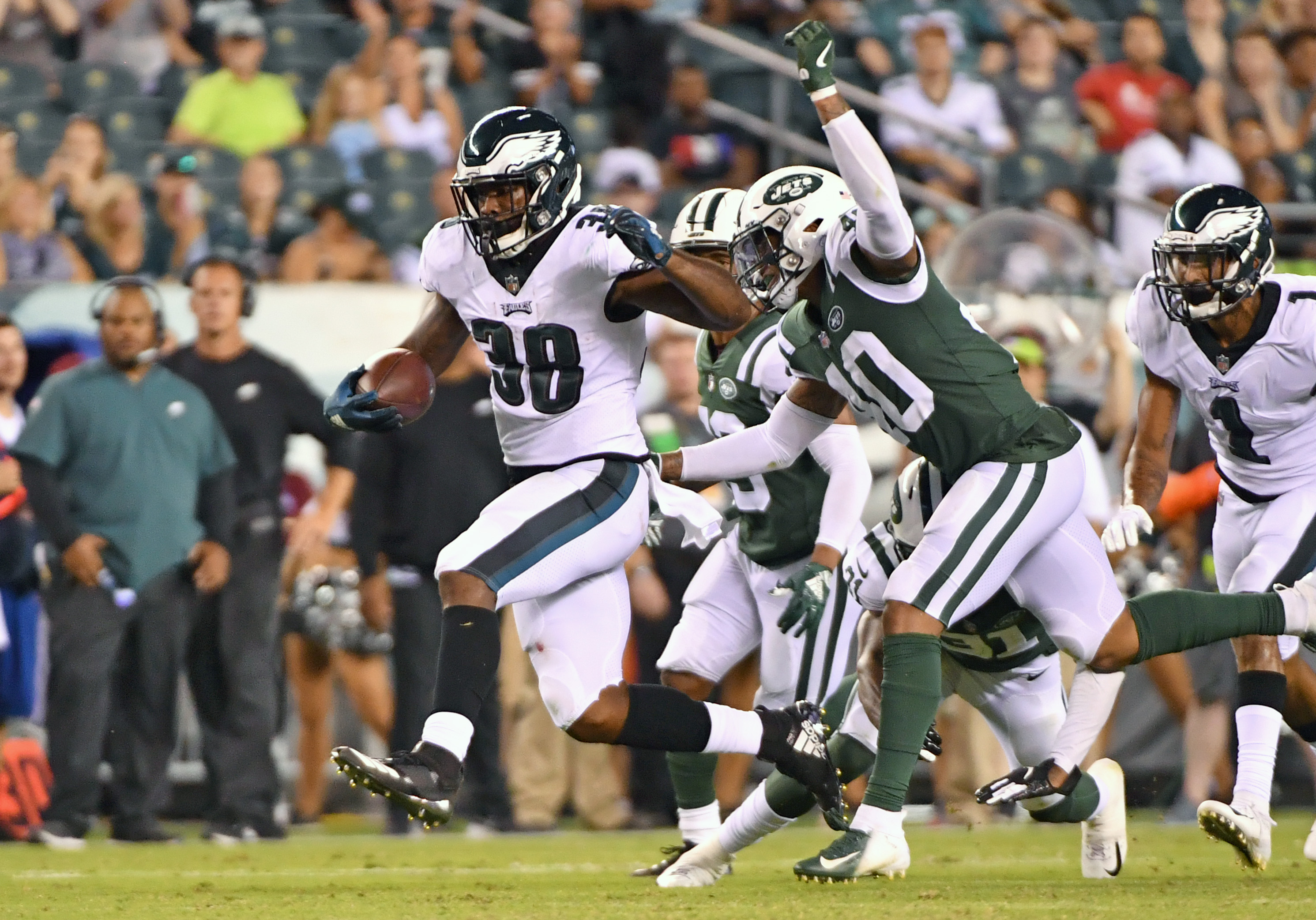 Aug 30, 2018; Philadelphia, PA, USA; Philadelphia Eagles running back Matt Jones (38) carries the ball past New York Jets defensive back Brandon Bryant (40) during the second half at Lincoln Financial Field. Mandatory Credit: Eric Hartline-USA TODAY Sports / Eric Hartline