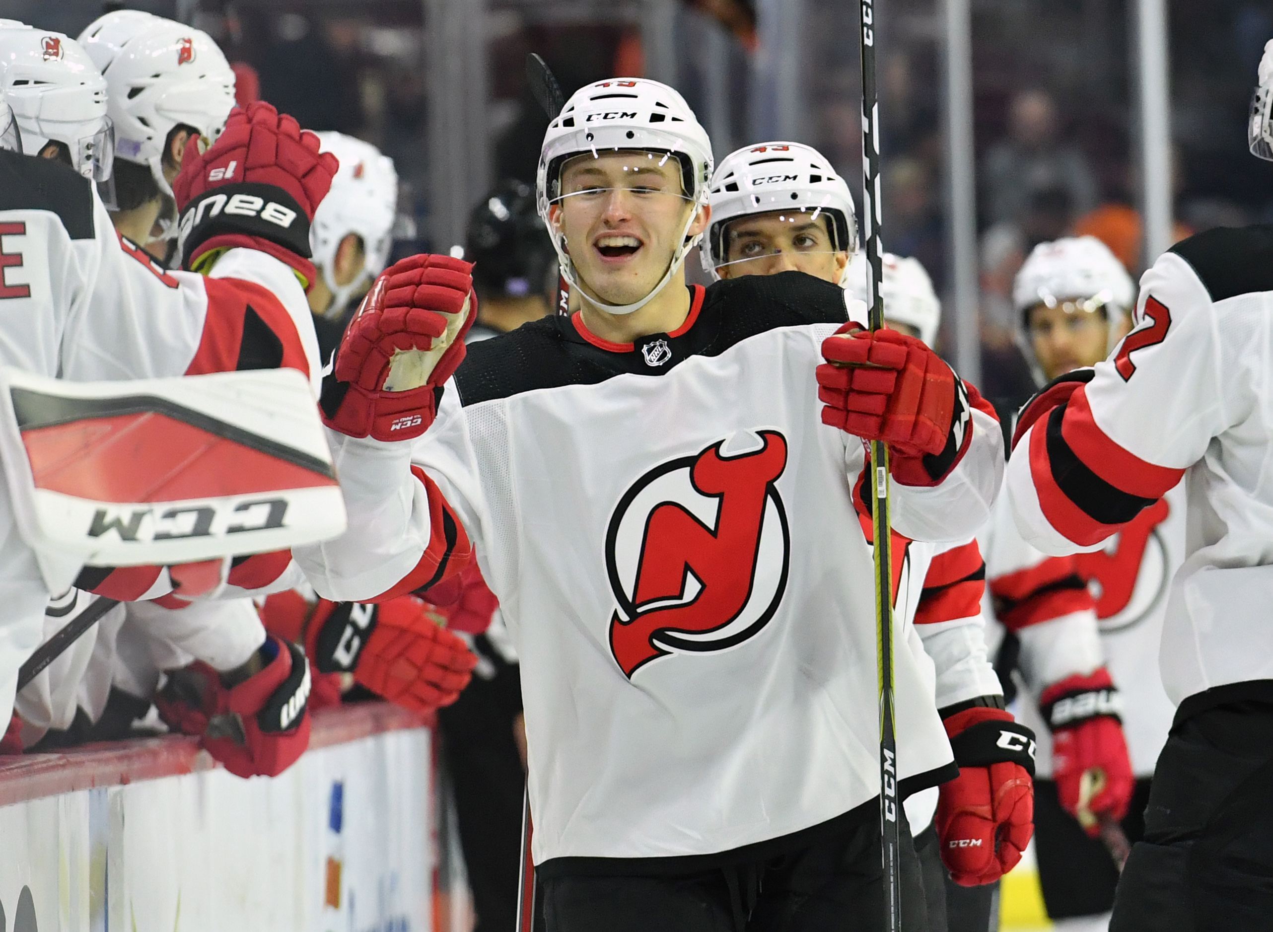 Nov 15, 2018; Philadelphia, PA, USA; New Jersey Devils right wing Joey Anderson (49) celebrates with teammates after scoring a goal against the Philadelphia Flyers during the first period at Wells Fargo Center. Mandatory Credit: Eric Hartline-USA TODAY Sports / Eric Hartline