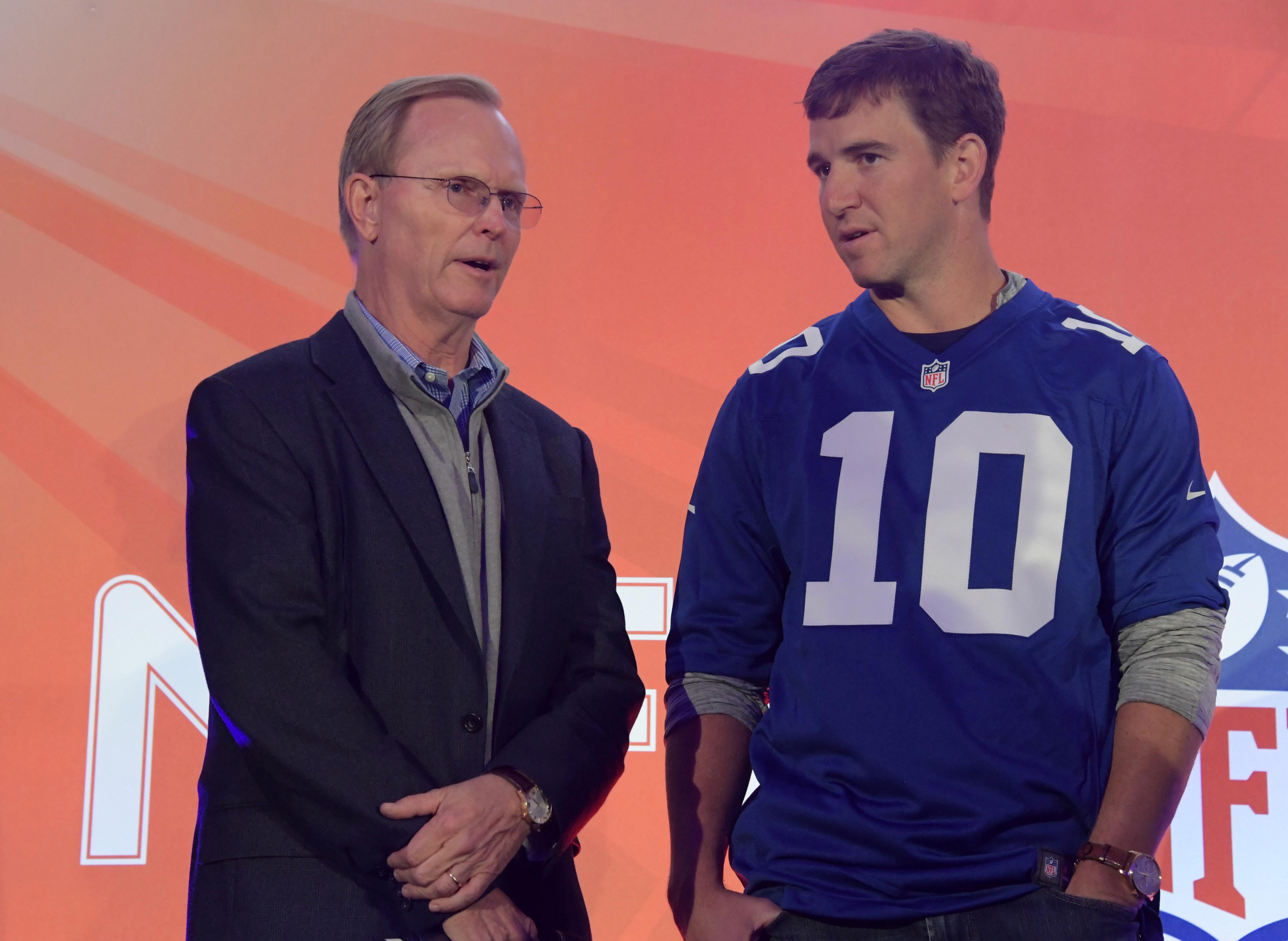 Oct 22, 2016; London, United Kingdom; New York Giants co-owner John Mara (left) and quarterback Eli Manning during NFL Fan Rally at the Victoria House prior to game 16 of the NFL International Series against the Los Angeles Rams. Mandatory Credit: Kirby Lee-USA TODAY Sports / Kirby Lee