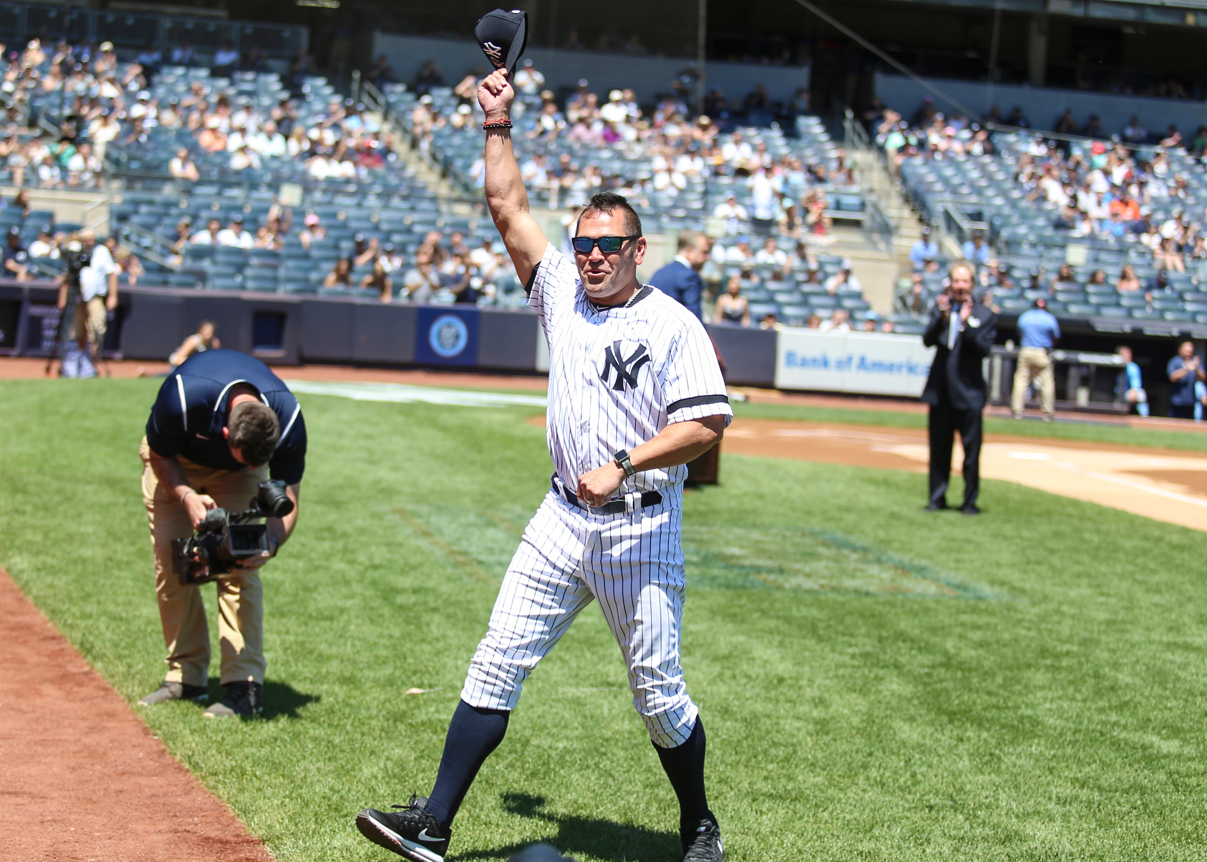 Jun 17, 2018; Bronx, NY, USA; Former New York Yankees Johnny Damon at the Old Timer's Day ceremony at Yankee Stadium. Mandatory Credit: Wendell Cruz-USA TODAY Sports / Wendell Cruz