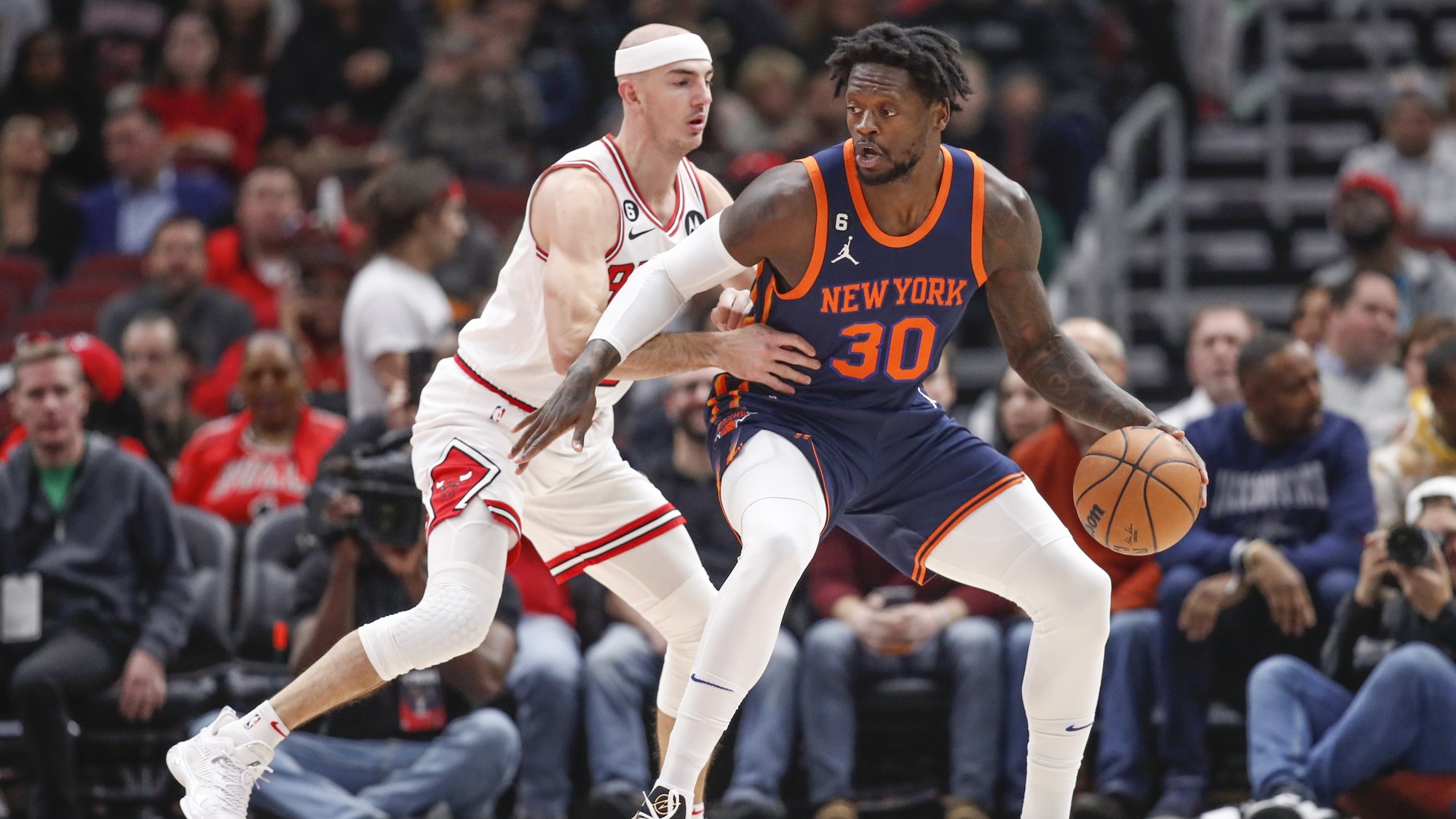 Nov 30, 2022; New York, New York, USA; New York Knicks forward Julius Randle (30) dribbles against Milwaukee Bucks forward Giannis Antetokounmpo (34) during the first half at Madison Square Garden. / Vincent Carchietta-USA TODAY Sports