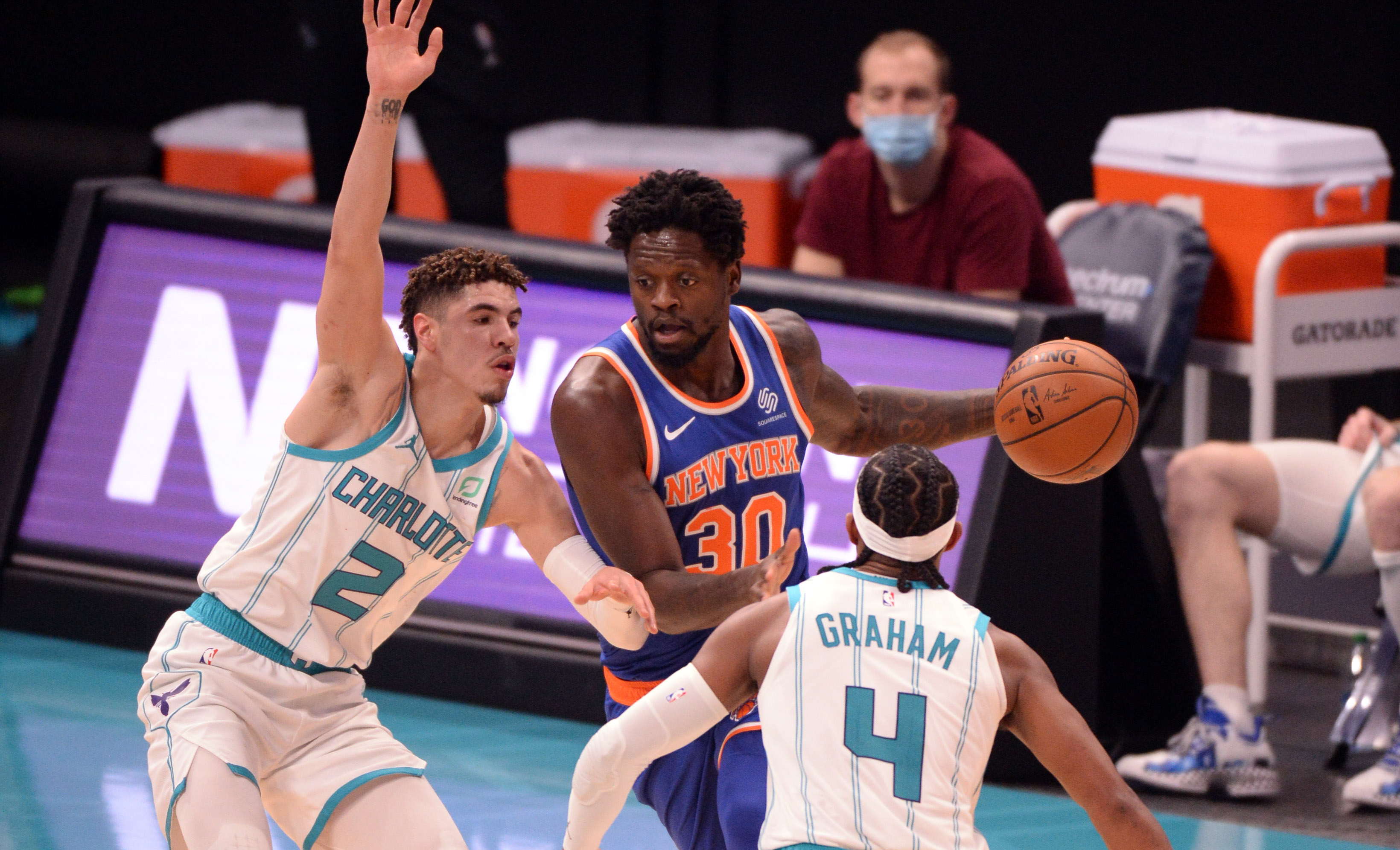 Julius Randle falls back down to earth as Knicks take 21-point beating from HornetsKevin Knox had his best game of the season1/12/2021, 4:04 AMCoby GreenFreelance Editorial ProducerJan 11, 2021; Charlotte, North Carolina, USA; New York Knicks forward center Julius Randle (30) dribbles the ball while defended by Charlotte Hornets guard LaMelo Ball (2) and guard Devonte Graham (4) during the second half at the Spectrum Center. / © Sam Sharpe-USA TODAY Sports