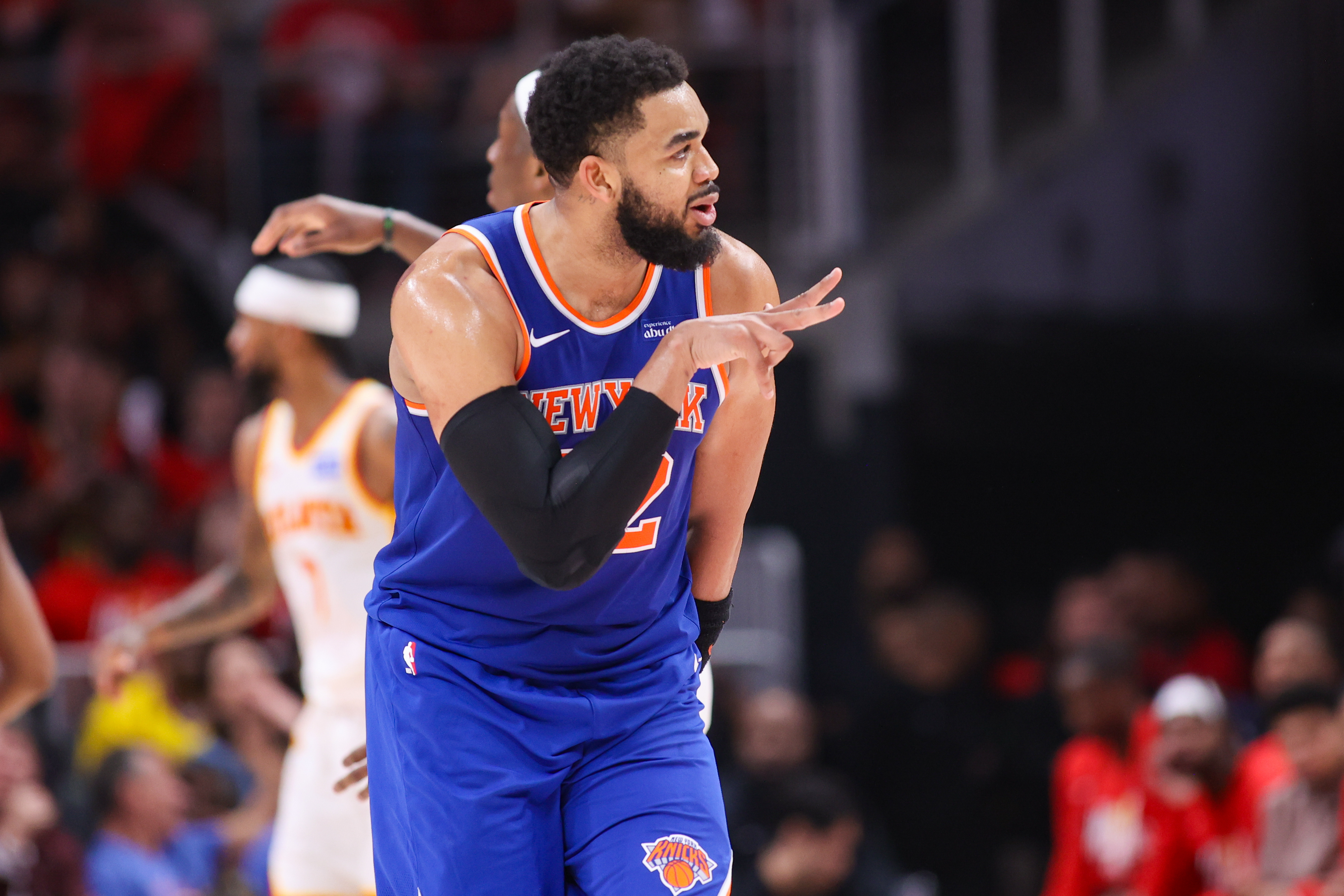 Apr 23, 2026; Atlanta, Georgia, USA; New York Knicks center Karl-Anthony Towns (32) is defended by Atlanta Hawks forward Mouhamed Gueye (18) in the third quarter during game three of the first round of the 2026 NBA Playoffs at State Farm Arena. / Brett Davis - Imagn Images
