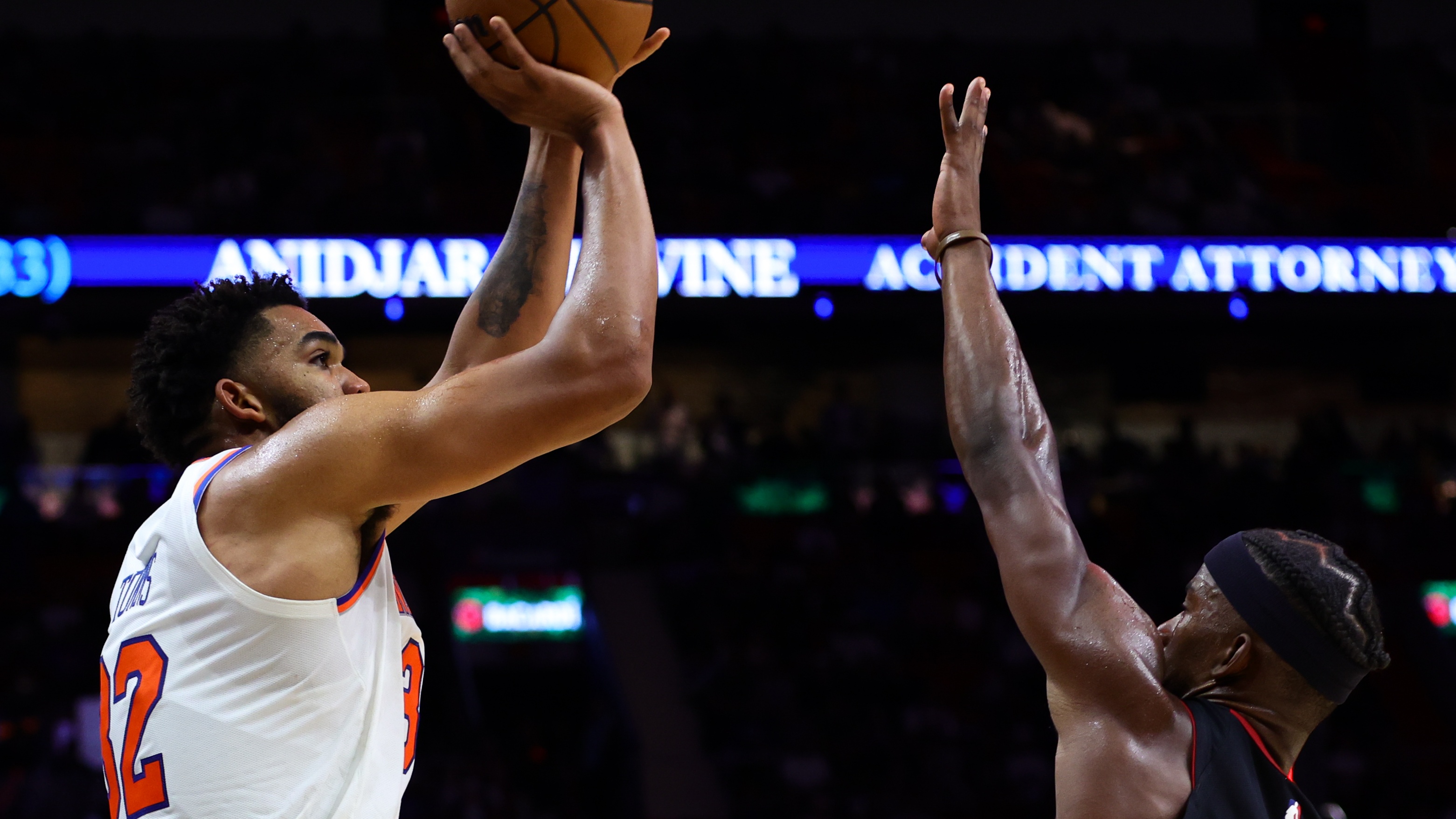 After quiet showing against Cavaliers, Karl-Anthony Towns responds with best game as a KnickTowns had his hands all over New York's come-from-behind win10/31/2024, 3:13 AMJohn FlaniganFreelance Editorial ProducerNew York Knicks center Karl-Anthony Towns (32) shoots the basketball over Miami Heat forward Jimmy Butler (22) during the fourth quarter at Kaseya Center / Sam Navarro - Imagn Images