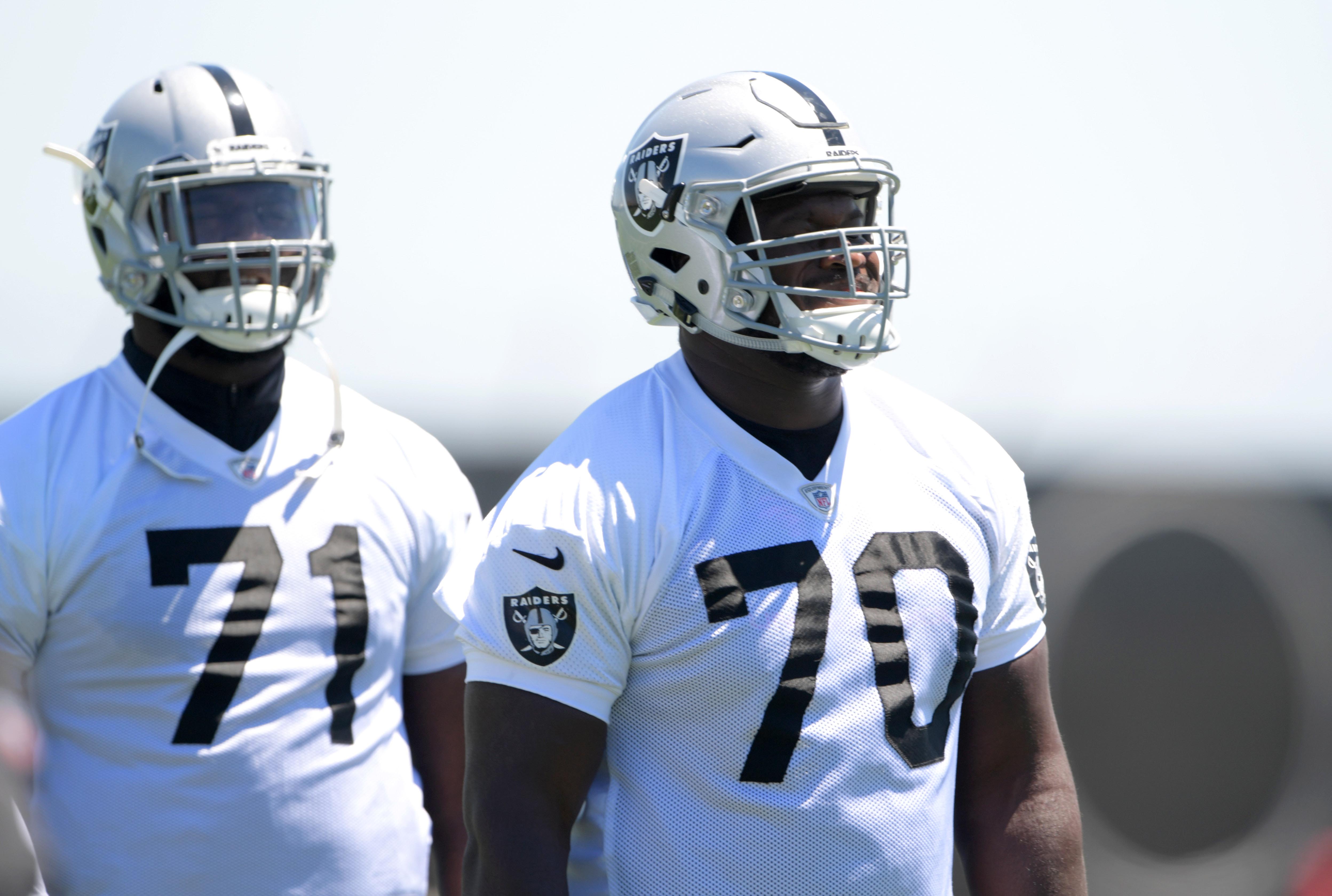 Jun 12, 2018; Alameda, CA, USA: Oakland Raiders tackle Kelechi Osemele (70) and tackle David Sharpe (71) during minicamp at the Raiders headquarters. Mandatory Credit: Kirby Lee-USA TODAY Sports / Kirby Lee