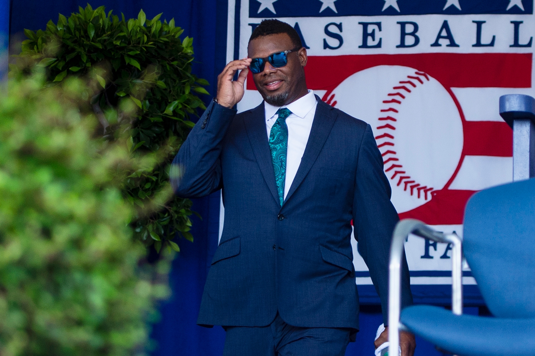 Jul 21, 2019; Cooperstown, NY, USA; Hall of Famer Ken Griffey Jr. is introduced during the 2019 National Baseball Hall of Fame induction ceremony at the Clark Sports Center. Mandatory Credit: Gregory J. Fisher-USA TODAY Sports / Gregory Fisher