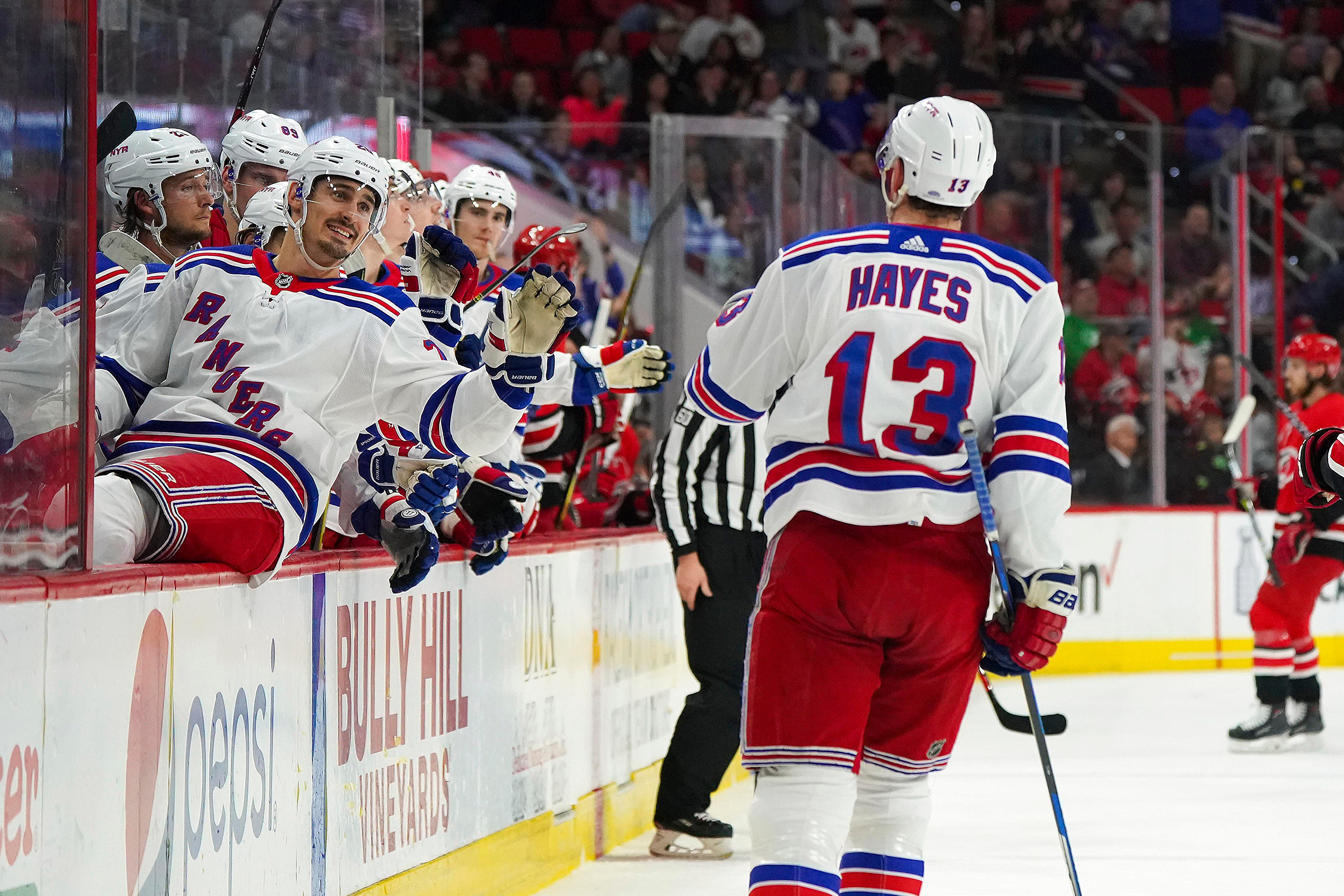 Mar 31, 2018; Raleigh, NC, USA; New York Rangers forward Chris Kreider (20) celebrates forward Kevin Hayes (13) after his second period goal against the Carolina Hurricanes at PNC Arena. Mandatory Credit: James Guillory-USA TODAY Sports / James Guillory