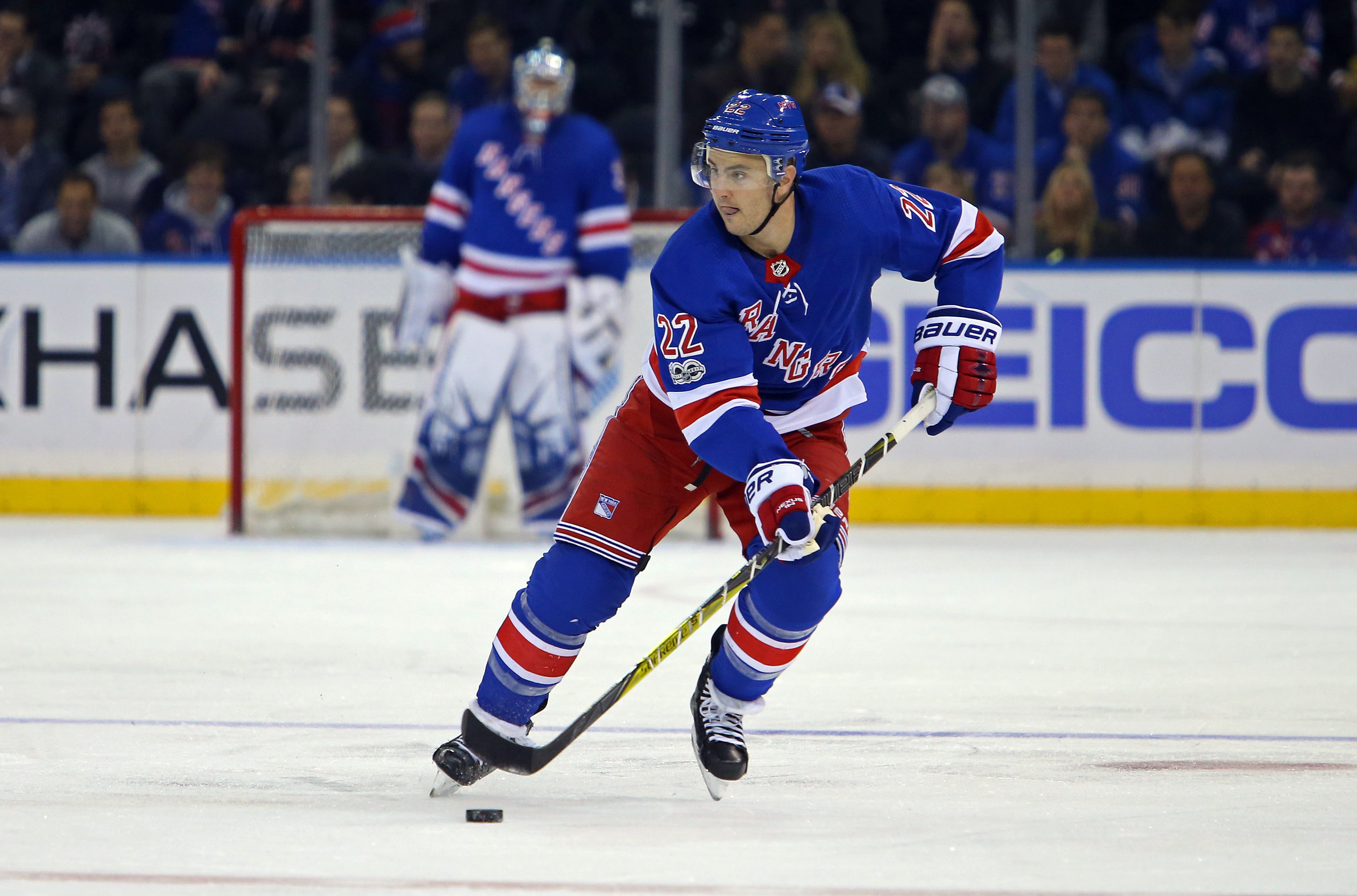 Oct 31, 2017; New York, NY, USA; New York Rangers defenseman Kevin Shattenkirk (22) skates with the puck against the Vegas Golden Knights during the second period at Madison Square Garden. Mandatory Credit: Danny Wild-USA TODAY Sports / Danny Wild
