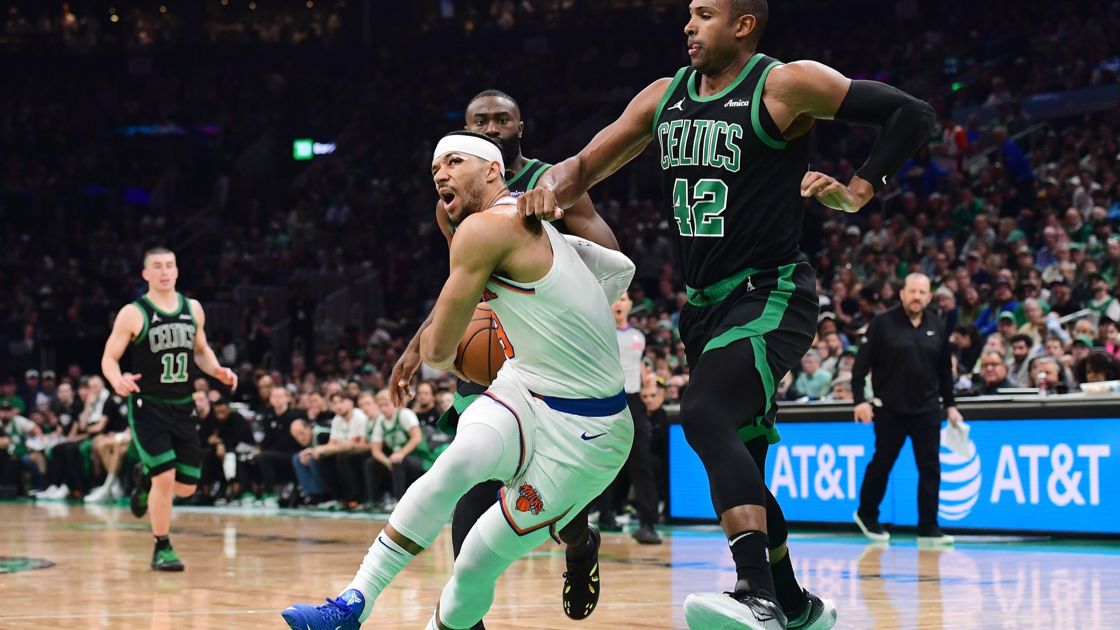 May 14, 2025; Boston, Massachusetts, USA; New York Knicks guard Josh Hart (3) loses his balance while Boston Celtics center Al Horford (42) defends in the first half during game five of the second round for the 2025 NBA Playoffs at TD Garden. / Bob DeChiara-Imagn Images