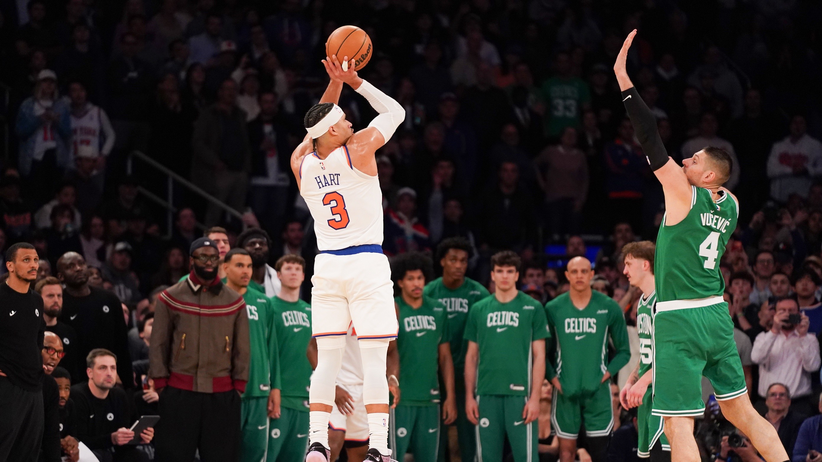 Josh Hart's fourth-quarter explosion helps Knicks hold on to 112-106 win over CelticsHart scored 15 of 26 points in final quarter4/10/2026, 2:09 AMPhillip MartinezEditorial ProducerApr 9, 2026; New York, New York, USA; New York Knicks guard Josh Hart (3) hits a three pointer late in the fourth quarter against the Boston Celtics at Madison Square Garden. / Lucas Boland-Imagn Images
