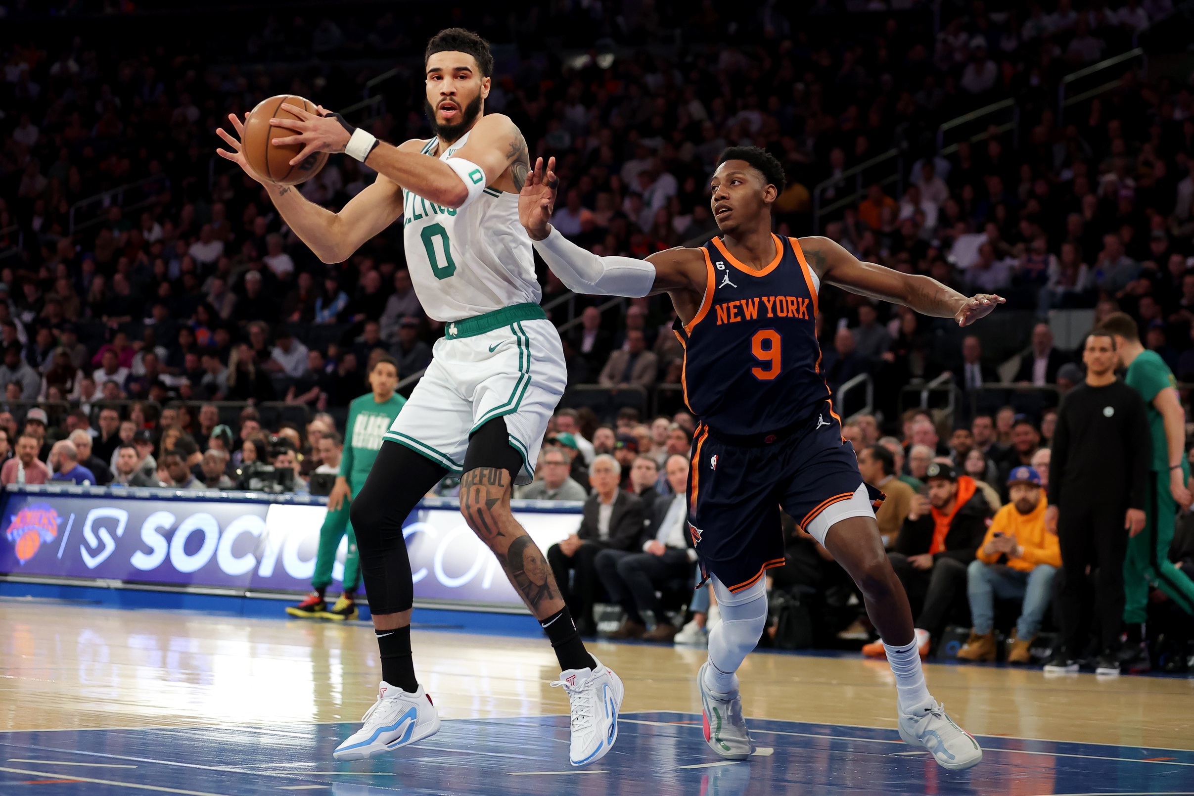 Knicks takeaways from Monday's 109-94 win over Celtics, including extending win streak to six gamesNew York moves up to fifth seed in Eastern Conference with win2/28/2023, 3:24 AMRobert SanchezFreelance Editorial ProducerBoston Celtics forward Jayson Tatum (0) controls the ball against New York Knicks guard RJ Barrett (9) during the first quarter at Madison Square Garden. / Brad Penner-USA TODAY Sports