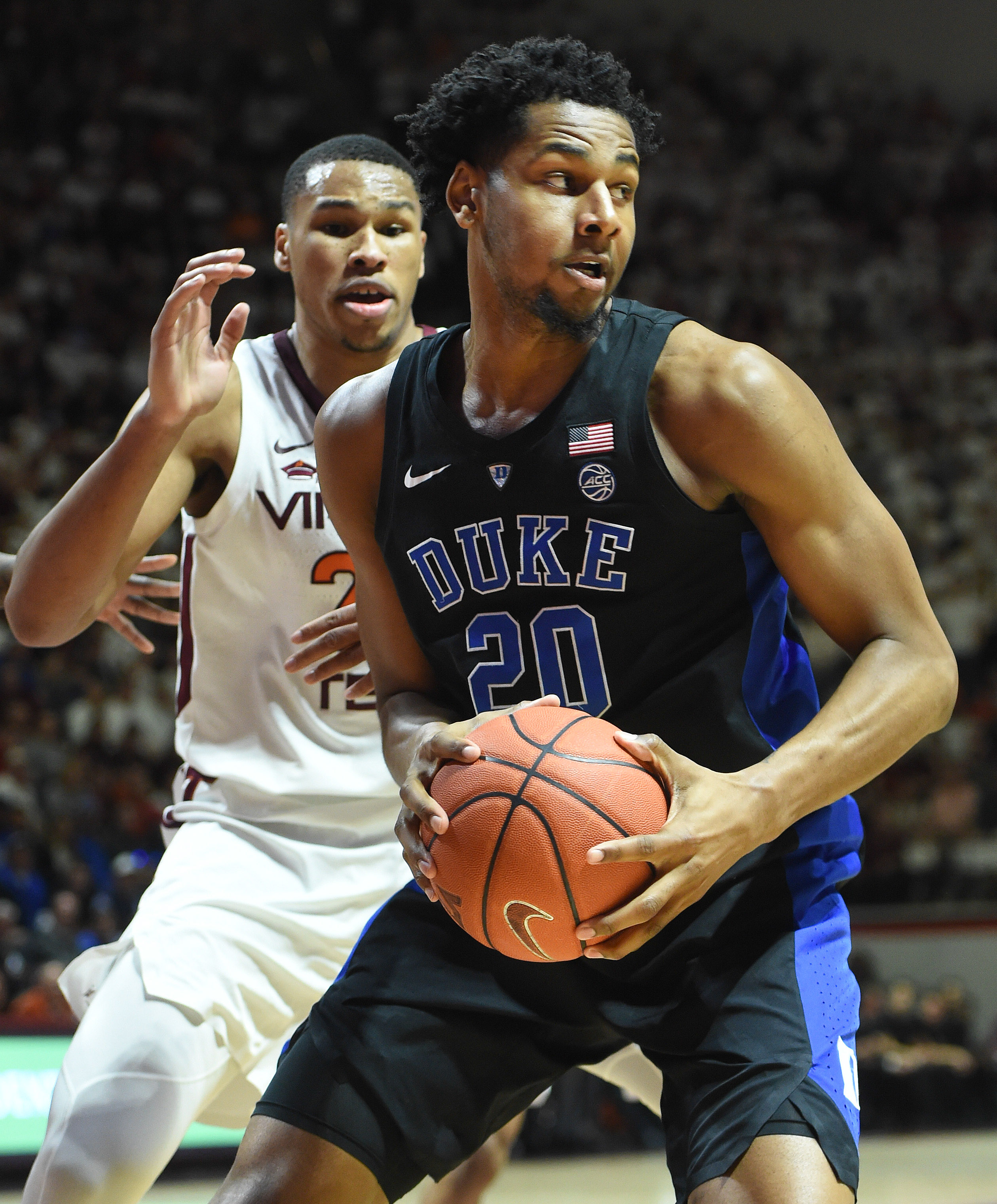 Feb 26, 2019; Blacksburg, VA, USA; Duke Blue Devils center Marques Bolden (20) looks to pass while being defended by Virginia Tech Hokies forward Kerry Blackshear Jr. (24) in the first half at Cassell Coliseum. Mandatory Credit: Michael Shroyer-USA TODAY Sports / Michael Thomas Shroyer
