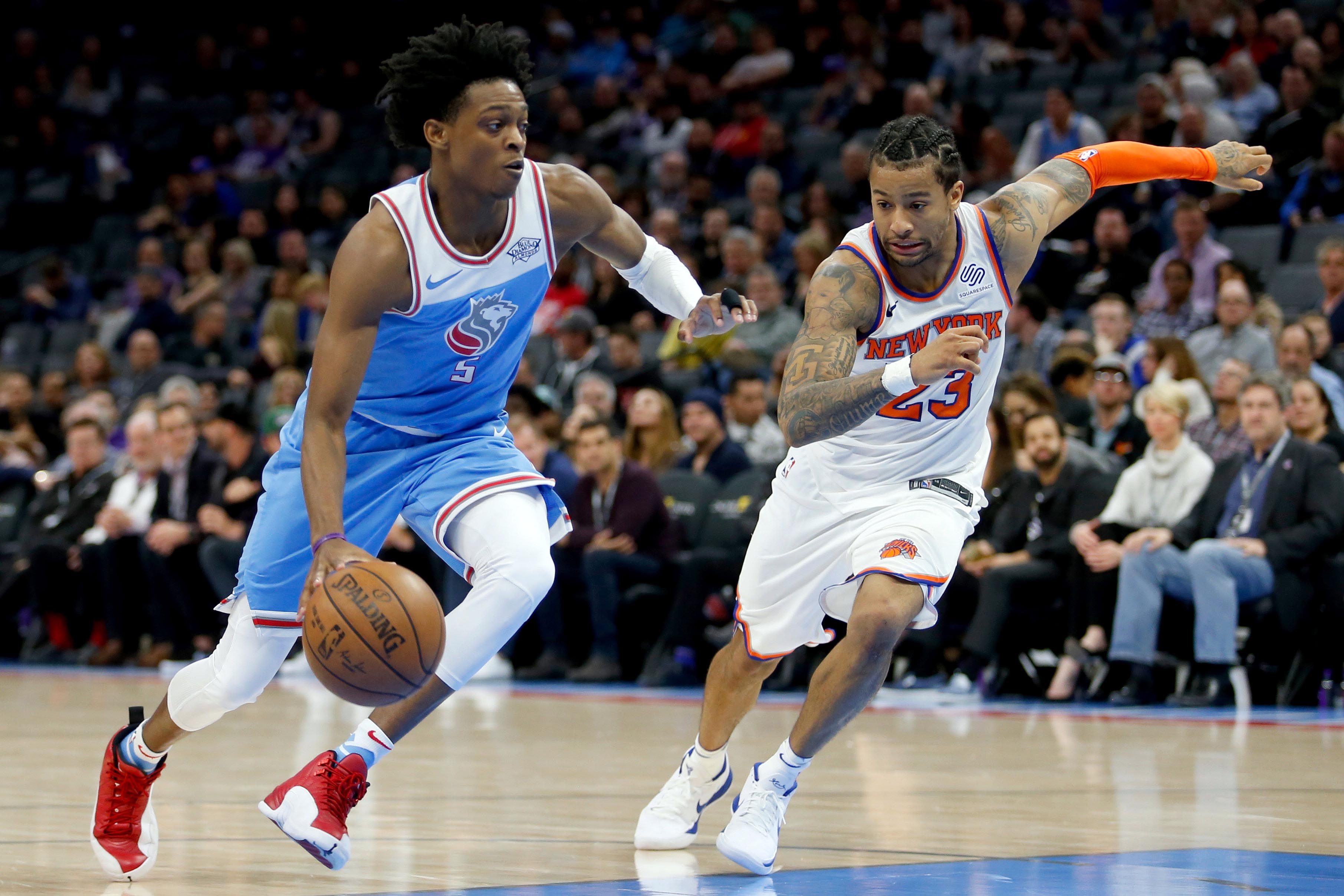 Mar 4, 2018; Sacramento, CA, USA; Sacramento Kings guard De'Aron Fox (5) drives the ball against New York Knicks guard Trey Burke (23) in the fourth quarter at Golden 1 Center. Mandatory Credit: Kiel Maddox-USA TODAY Sports / Kiel Maddox