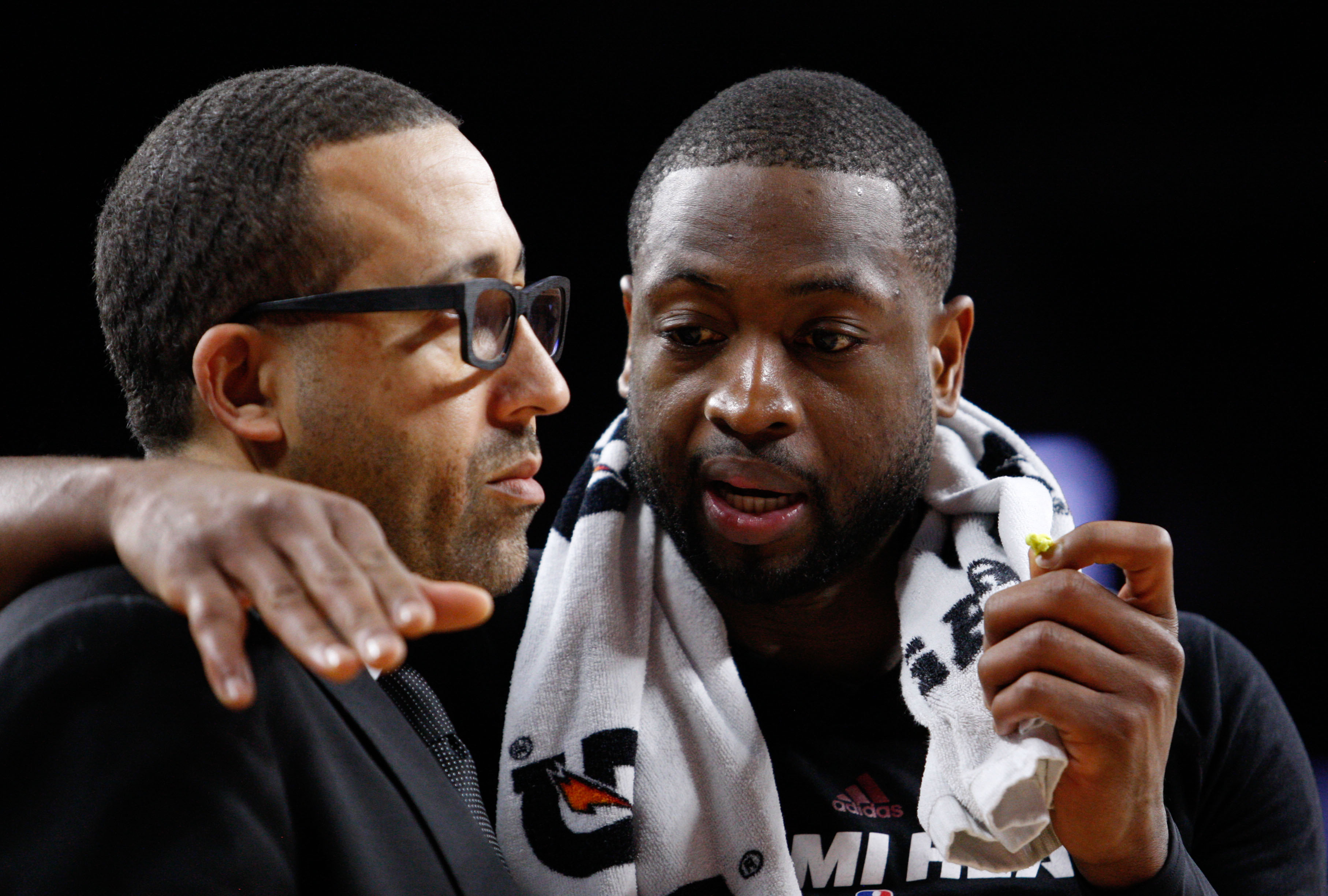 Apr 12, 2016; Auburn Hills, MI, USA; Miami Heat guard Dwyane Wade (3) talks to assistant head coach David Fizdale during the third quarter against the Detroit Pistons at The Palace of Auburn Hills. Heat win 99-93. Mandatory Credit: Raj Mehta-USA TODAY Sports / Raj Mehta