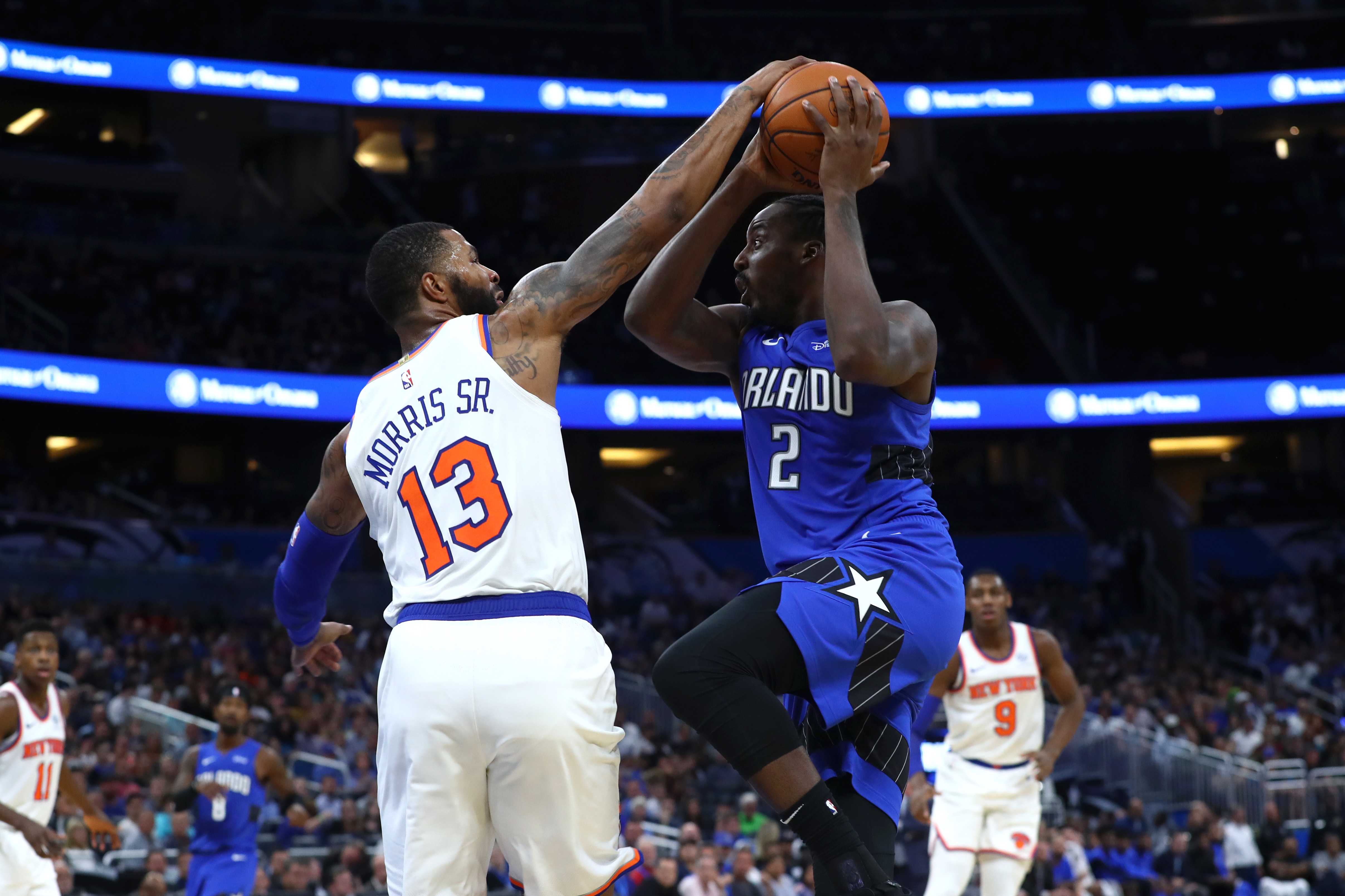 Oct 30, 2019; Orlando, FL, USA; Orlando Magic forward Al-Farouq Aminu (2) drives to the basket against New York Knicks forward Marcus Morris Sr. (13) at Amway Center. Mandatory Credit: Kim Klement-USA TODAY Sports / Kim Klement