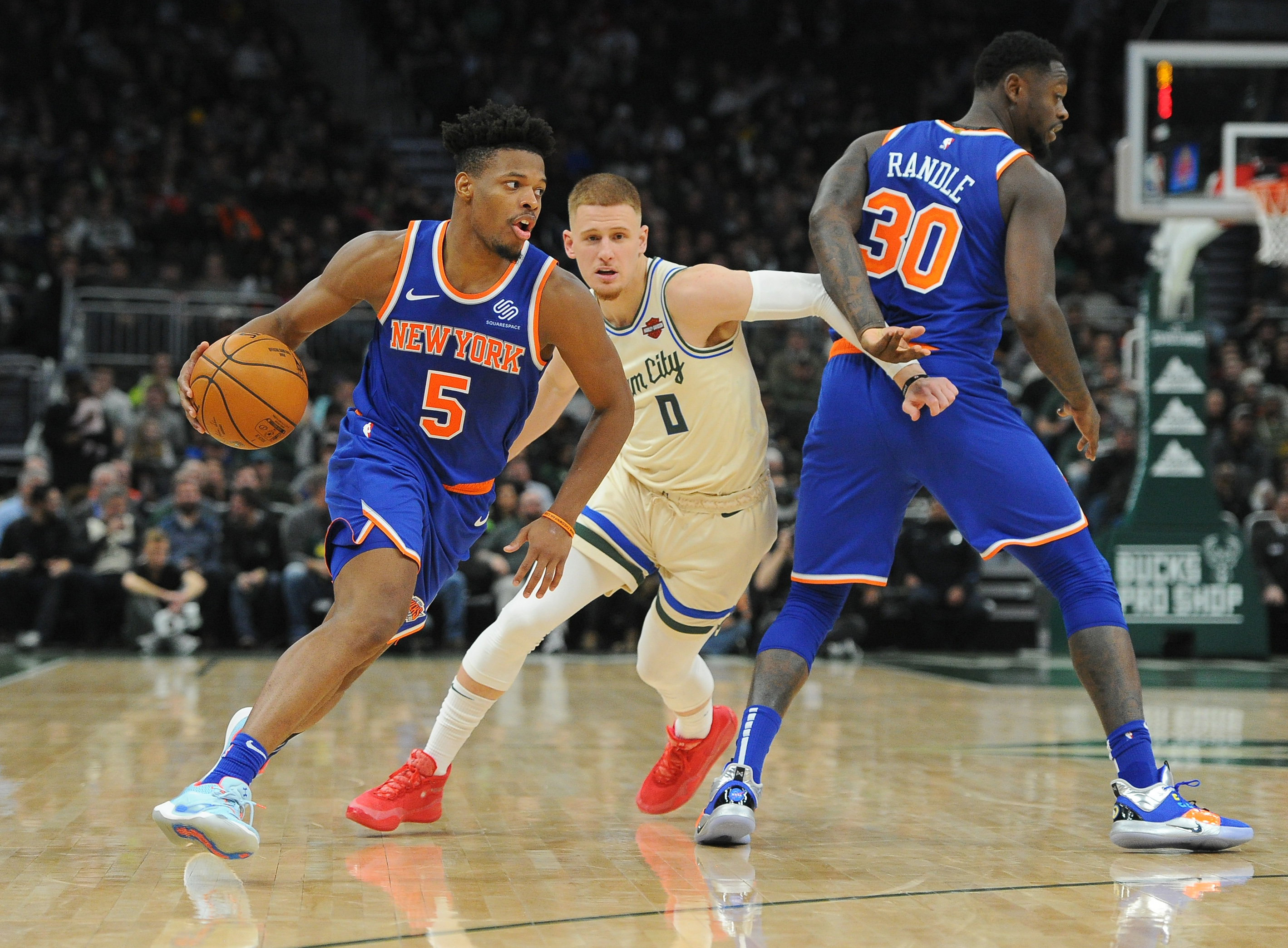 Dec 2, 2019; Milwaukee, WI, USA; New York Knicks guard Dennis Smith Jr. (5) drives to the basket with a pick set by Knicks forward Julius Randle (30) against Milwaukee Bucks guard Donte DiVincenzo (0) in the third quarter at Fiserv Forum. Mandatory Credit: Michael McLoone-USA TODAY Sports / Michael McLoone