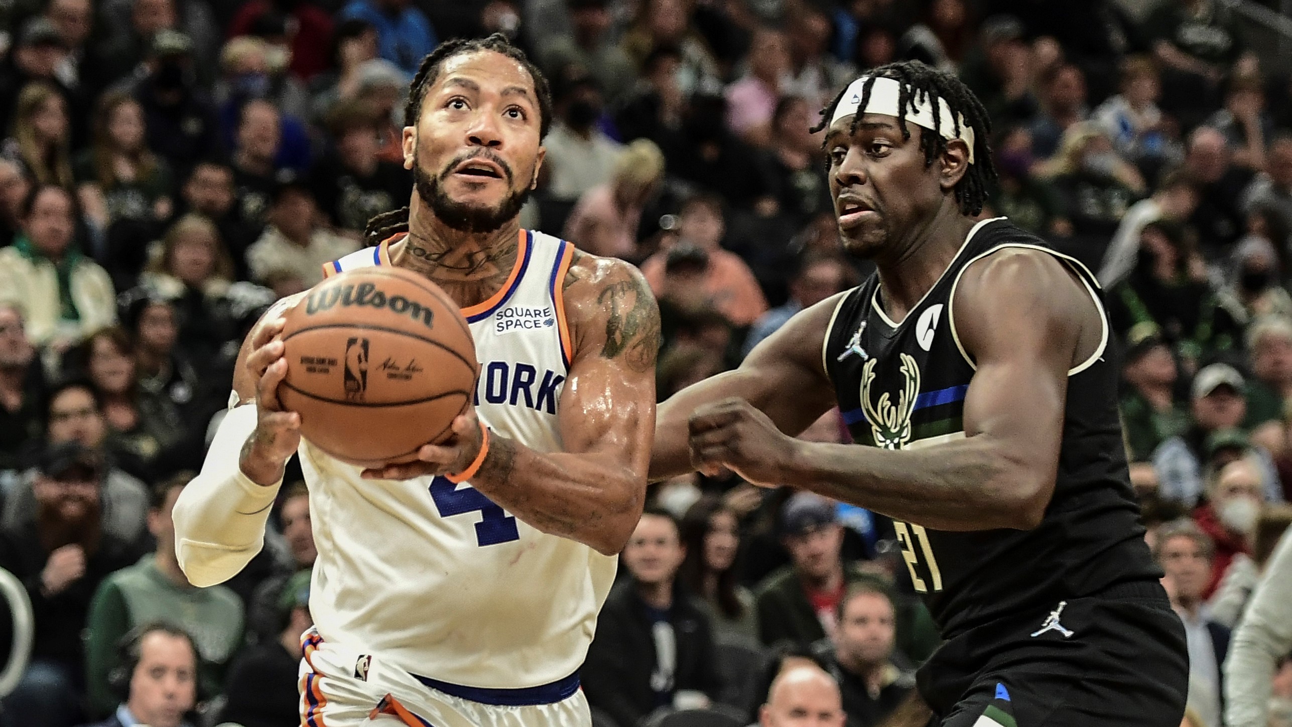 Knicks’ Derrick Rose questionable for Tuesday's game against LakersTaj Gibson is listed as doubtful and Mitchell Robinson won't play11/22/2021, 10:13 PMPhillip MartinezEditorial ProducerNov 5, 2021; Milwaukee, Wisconsin, USA; New York Knicks guard Derrick Rose (4) drives for the basket against Milwaukee Bucks guard Jrue Holiday (21) in the second quarter at Fiserv Forum. / Benny Sieu-USA TODAY Sports