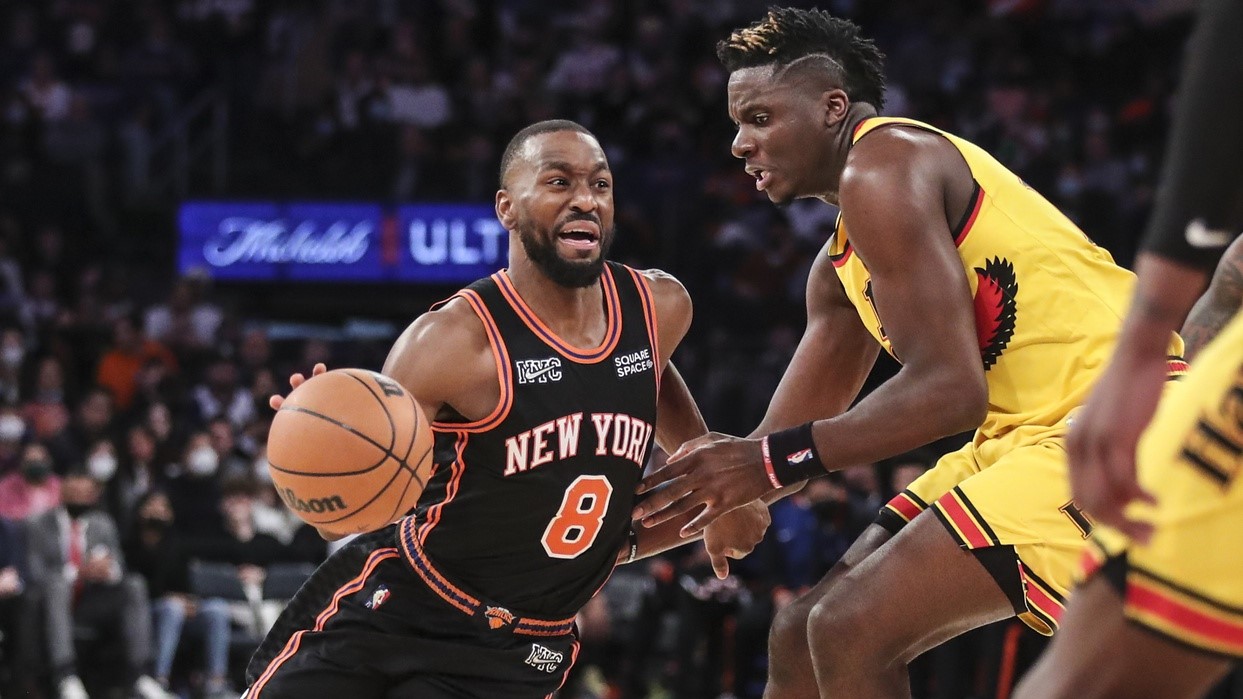 Dec 25, 2021; New York, New York, USA; New York Knicks guard Kemba Walker (8) reacts to the crowd chanting his name in the fourth quarter after he recorded a triple double against the Atlanta Hawks at Madison Square Garden. / Wendell Cruz-USA TODAY Sports