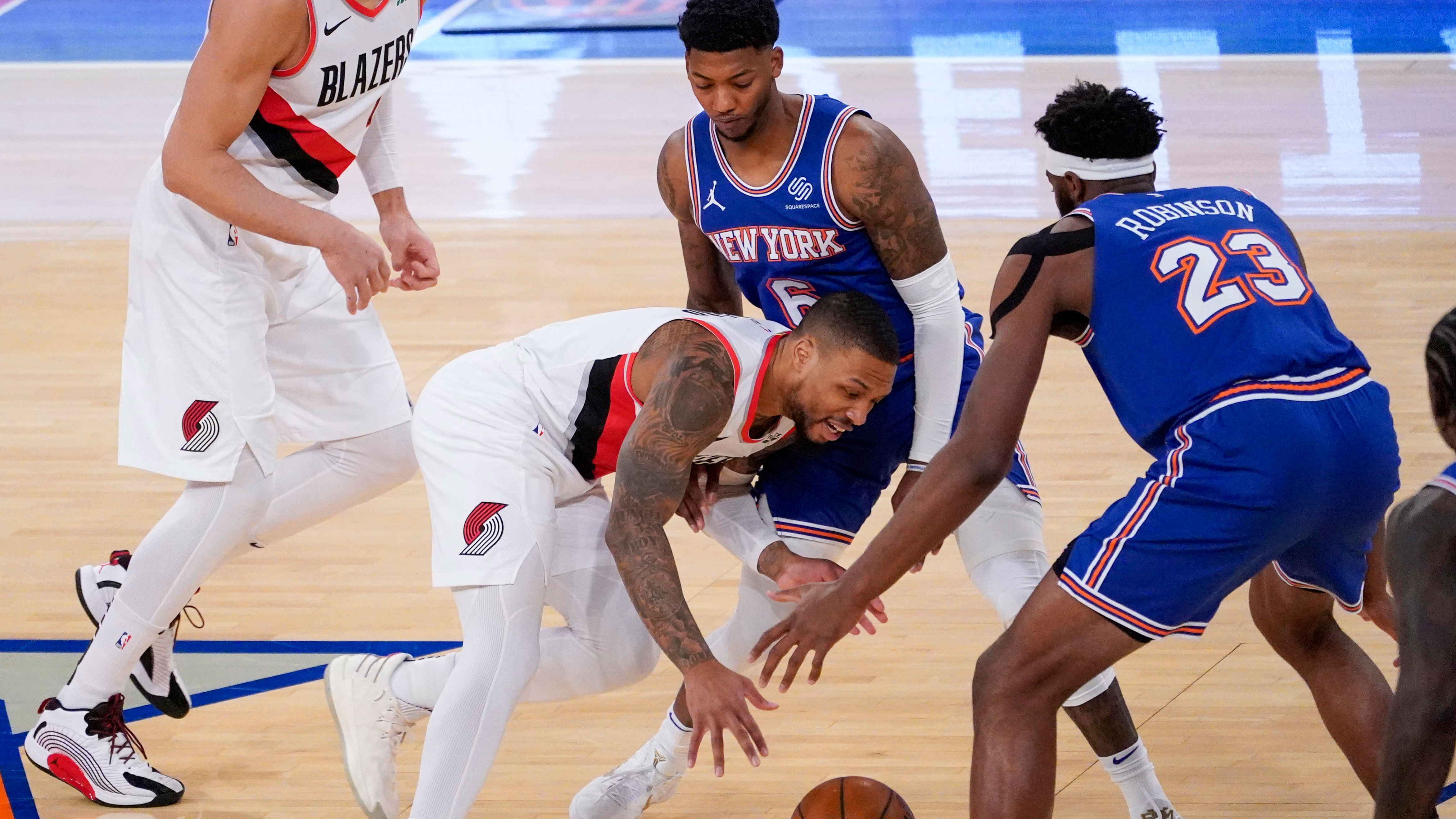 Feb 6, 2021; New York, New York, USA; Portland Trail Blazers guard Damian Lillard (0) drives against New York Knicks center Mitchell Robinson (23) and guard Elfrid Payton (6) during the first half of an NBA basketball game, Saturday, Feb. 6, 2021, in New York. / Mary Altaffer/Pool Photo-USA TODAY Sports