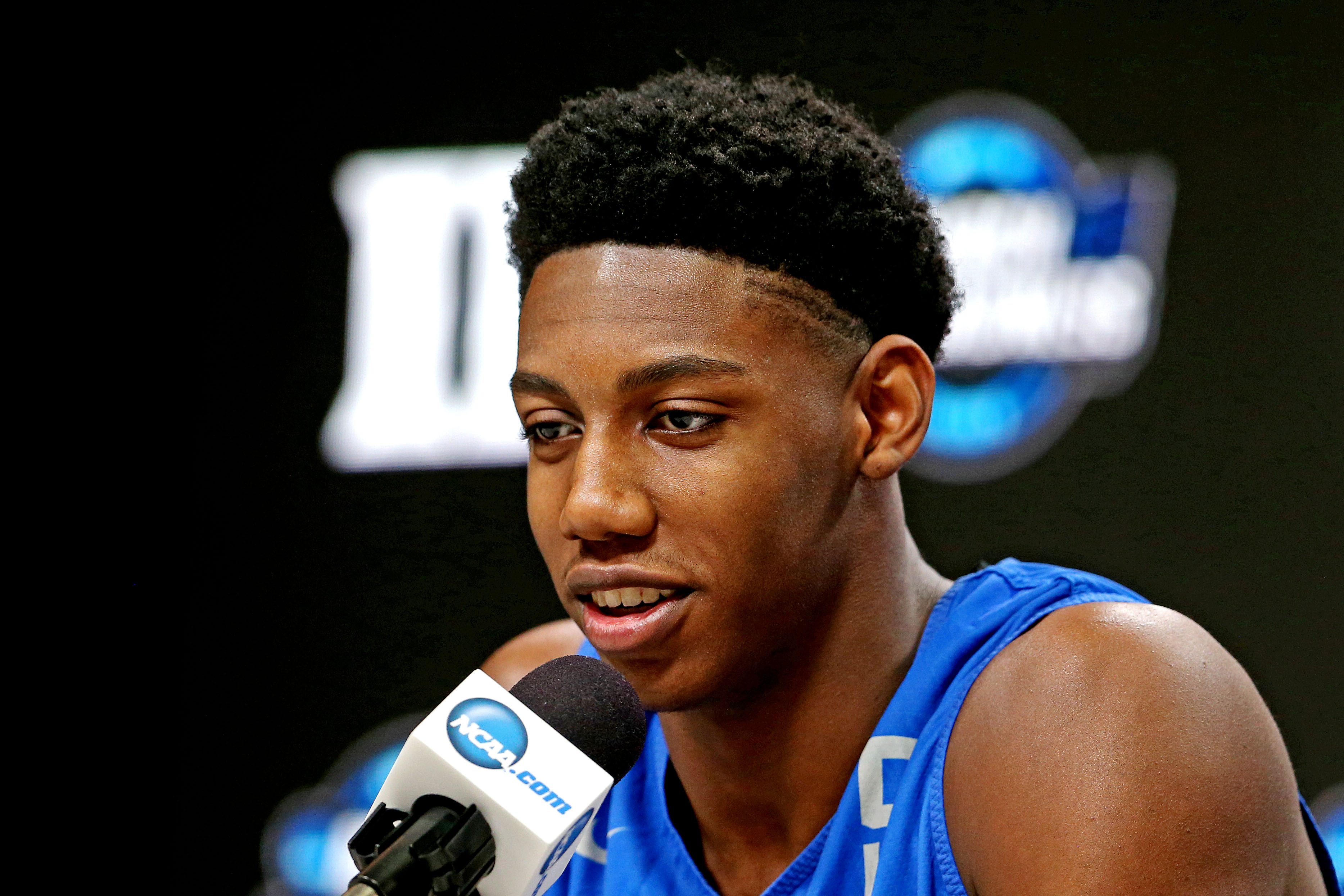 Duke Blue Devils forward RJ Barrett speaks in a press conference during practice for the East Regional of the 2019 NCAA Tournament at Capital One Arena. / Peter Casey/USA TODAY Sports