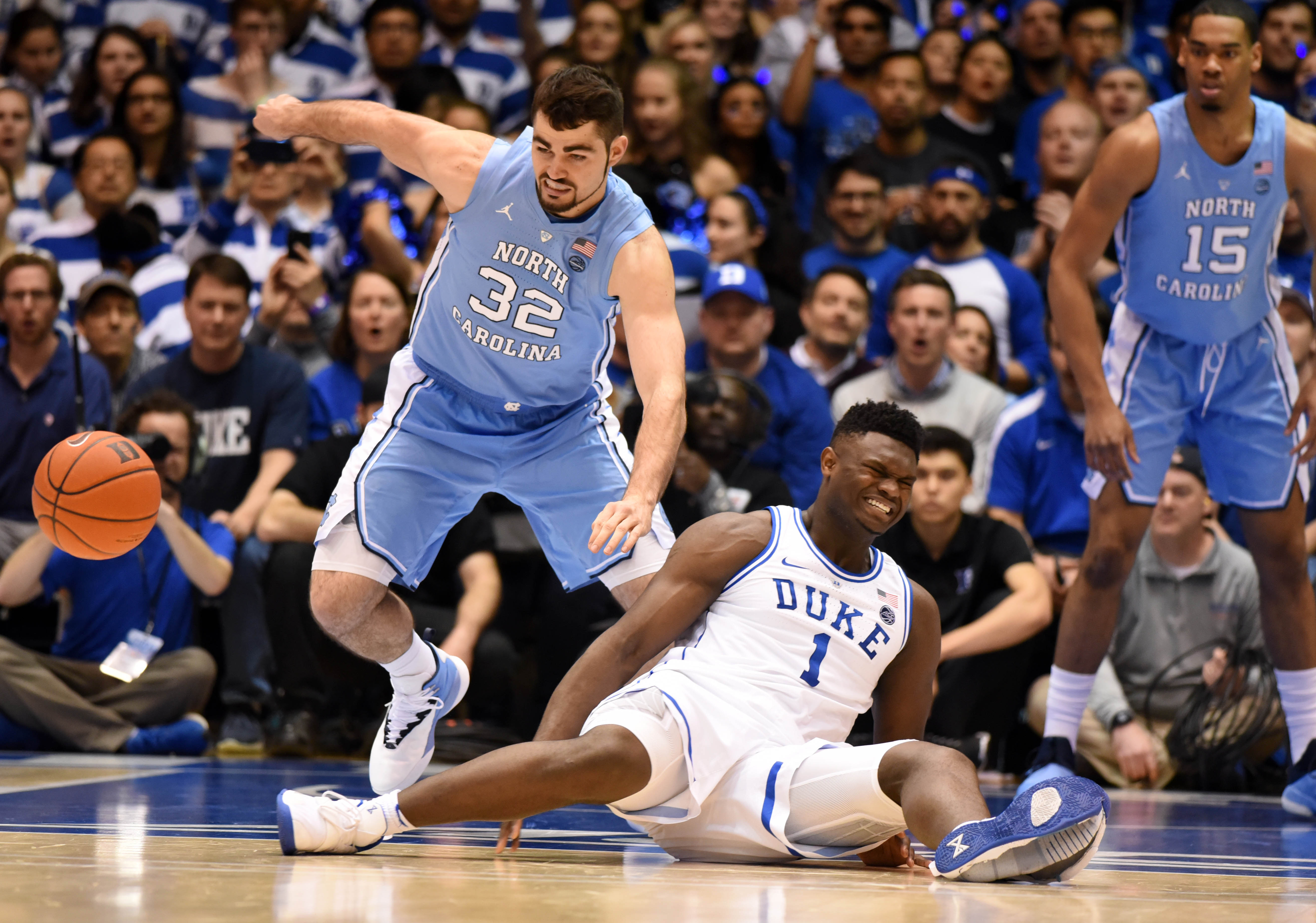Feb 20, 2019; Durham, NC, USA; Duke Blue Devils forward Zion Williamson (1) reacts after falling during the first half against the North Carolina Tar Heels at Cameron Indoor Stadium. Mandatory Credit: Rob Kinnan-USA TODAY Sports / Rob Kinnan