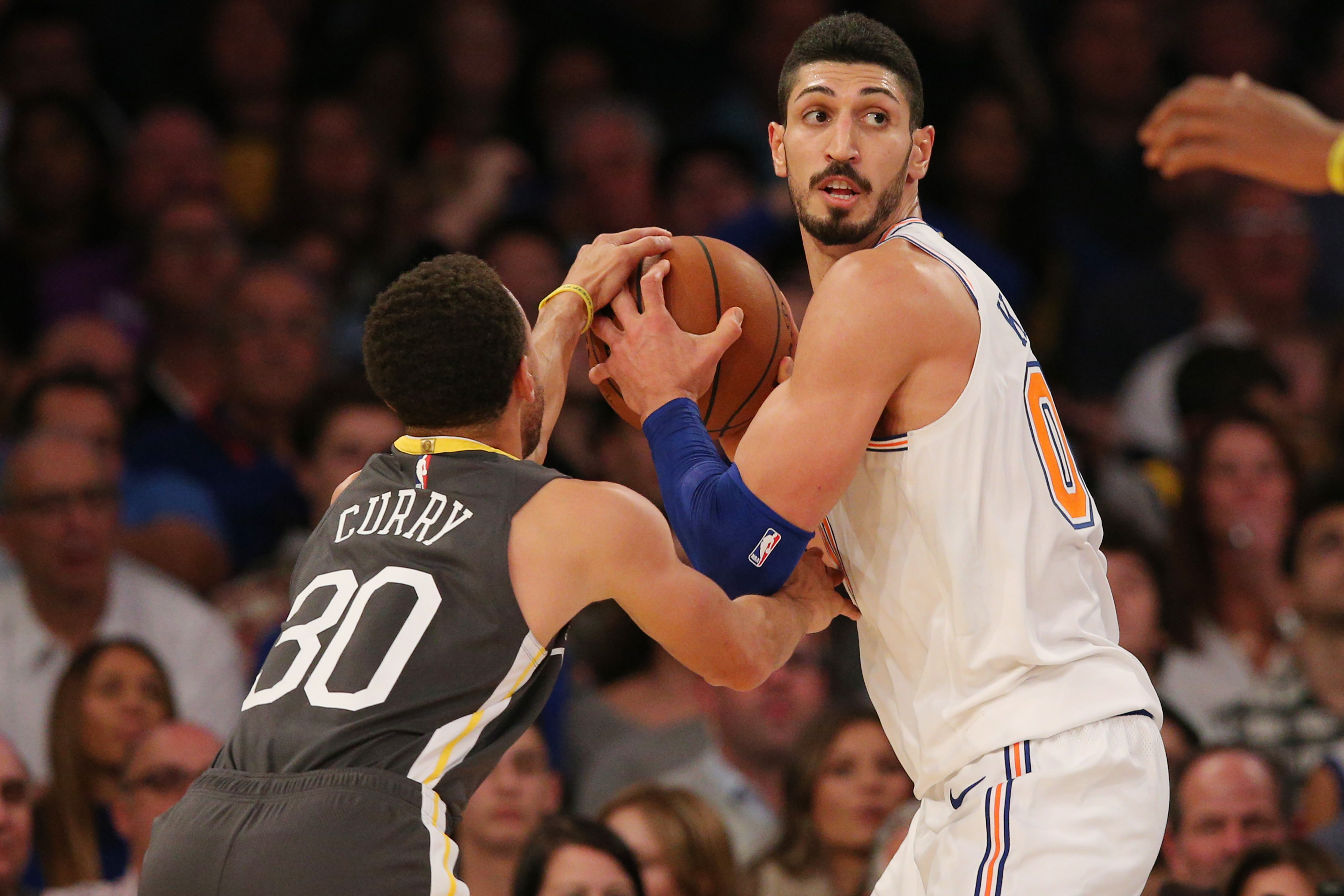 Oct 26, 2018; New York, NY, USA; New York Knicks center Enes Kanter (00) controls the ball against Golden State Warriors guard Stephen Curry (30) during the second quarter at Madison Square Garden. Mandatory Credit: Brad Penner-USA TODAY Sports / Brad Penner