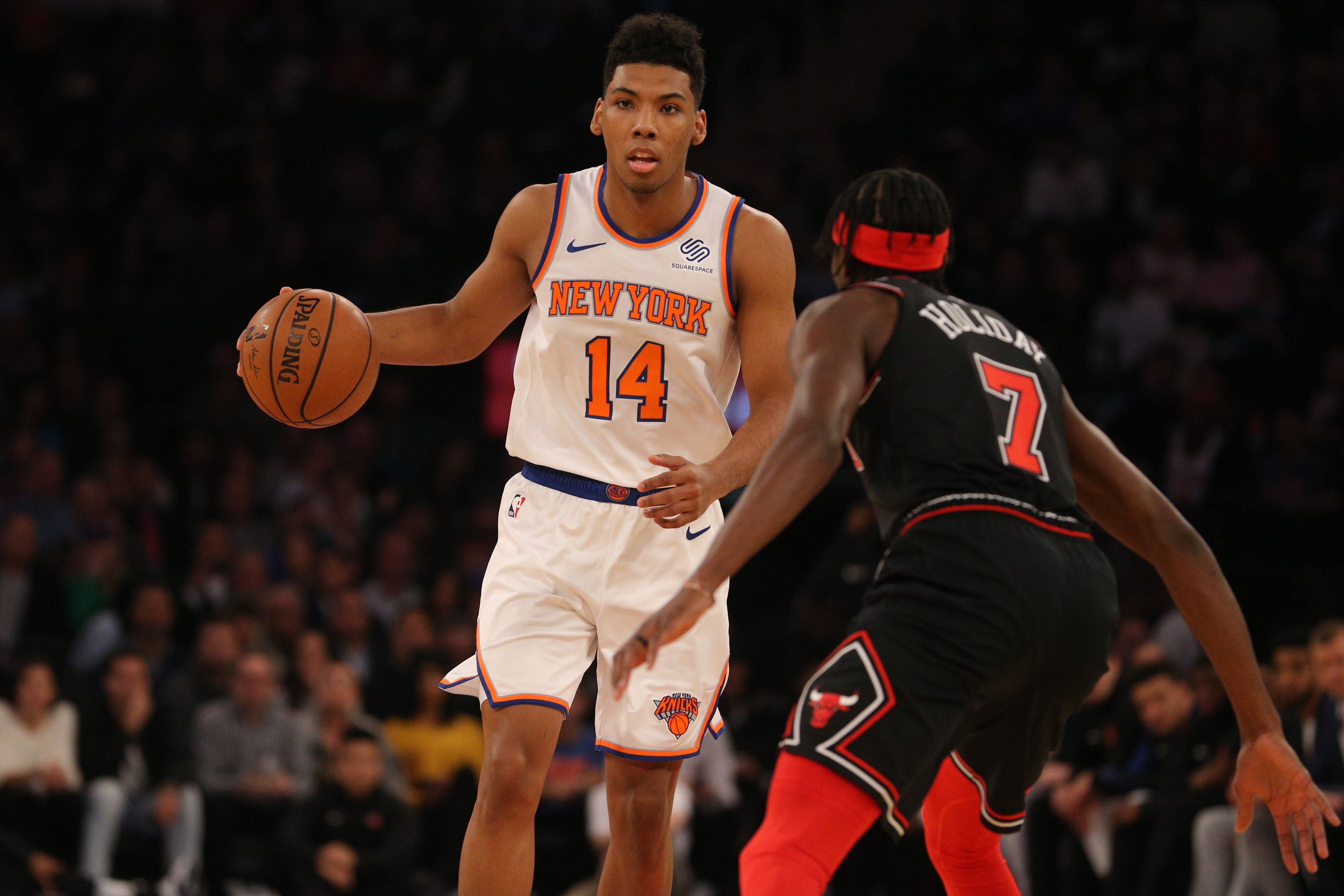 New York Knicks shooting guard Allonzo Trier controls the ball against Chicago Bulls small forward Justin Holiday during the first quarter at Madison Square Garden. / Brad Penner/USA TODAY Sports