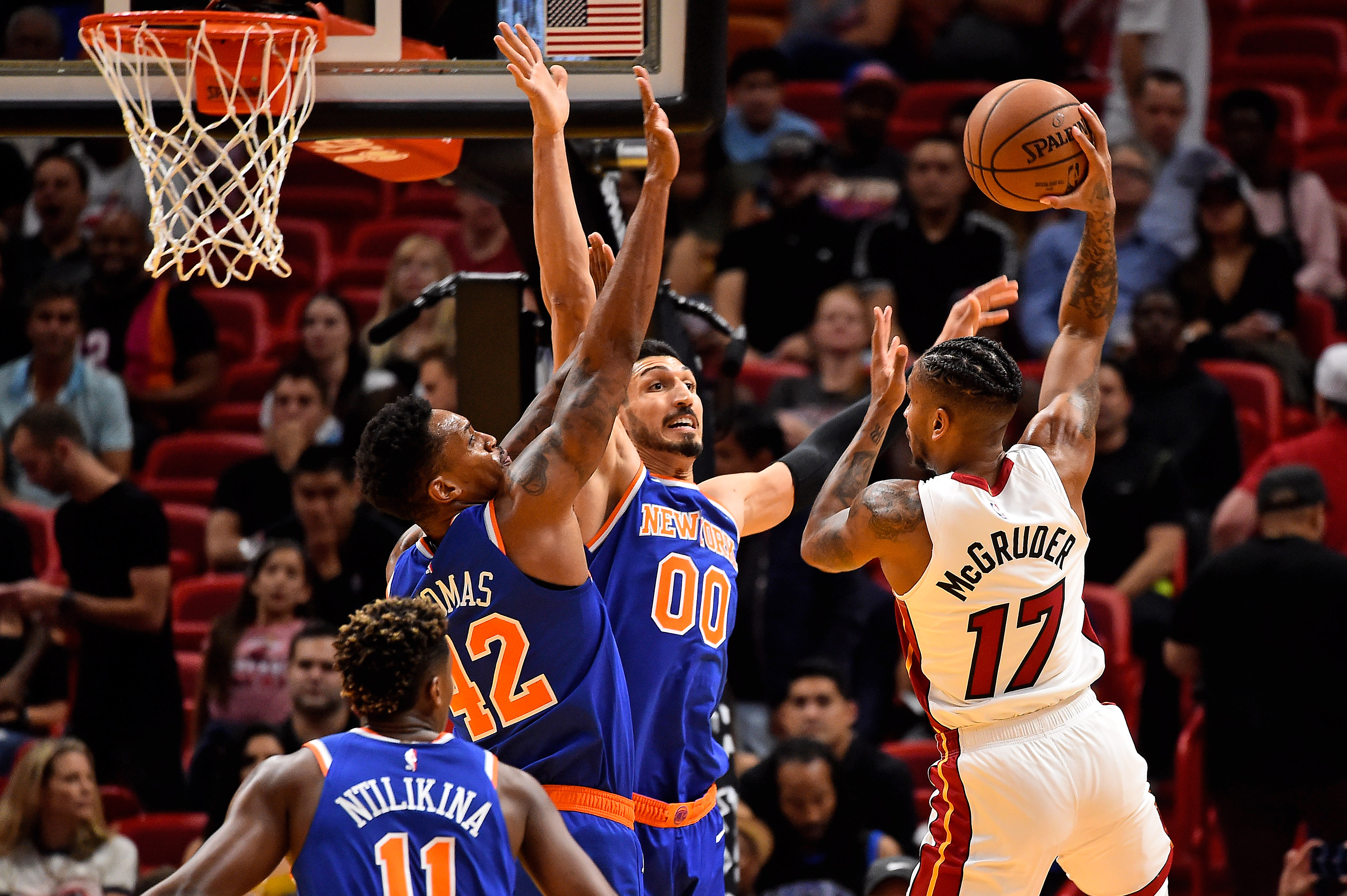 Oct 24, 2018; Miami, FL, USA; Miami Heat forward Rodney McGruder (17) passes the ball around New York Knicks forward Lance Thomas (42) and center Enes Kanter (00) during the first half at American Airlines Arena. Mandatory Credit: Jasen Vinlove-USA TODAY Sports / Jasen Vinlove