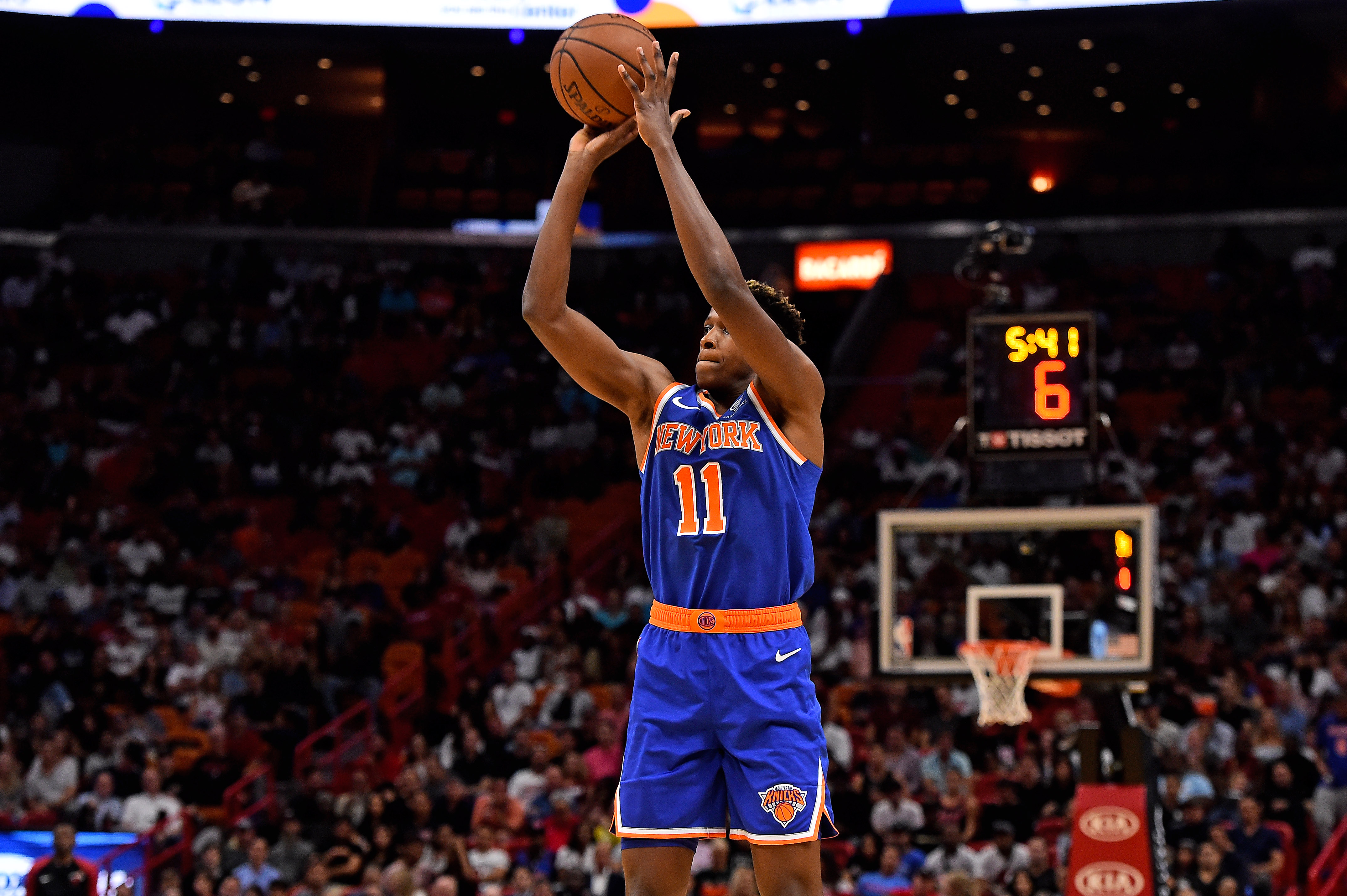 New York Knicks guard Frank Ntilikina shoots the ball against the Miami Heat during the first half at American Airlines Arena. / Jasen Vinlove/USA TODAY Sports