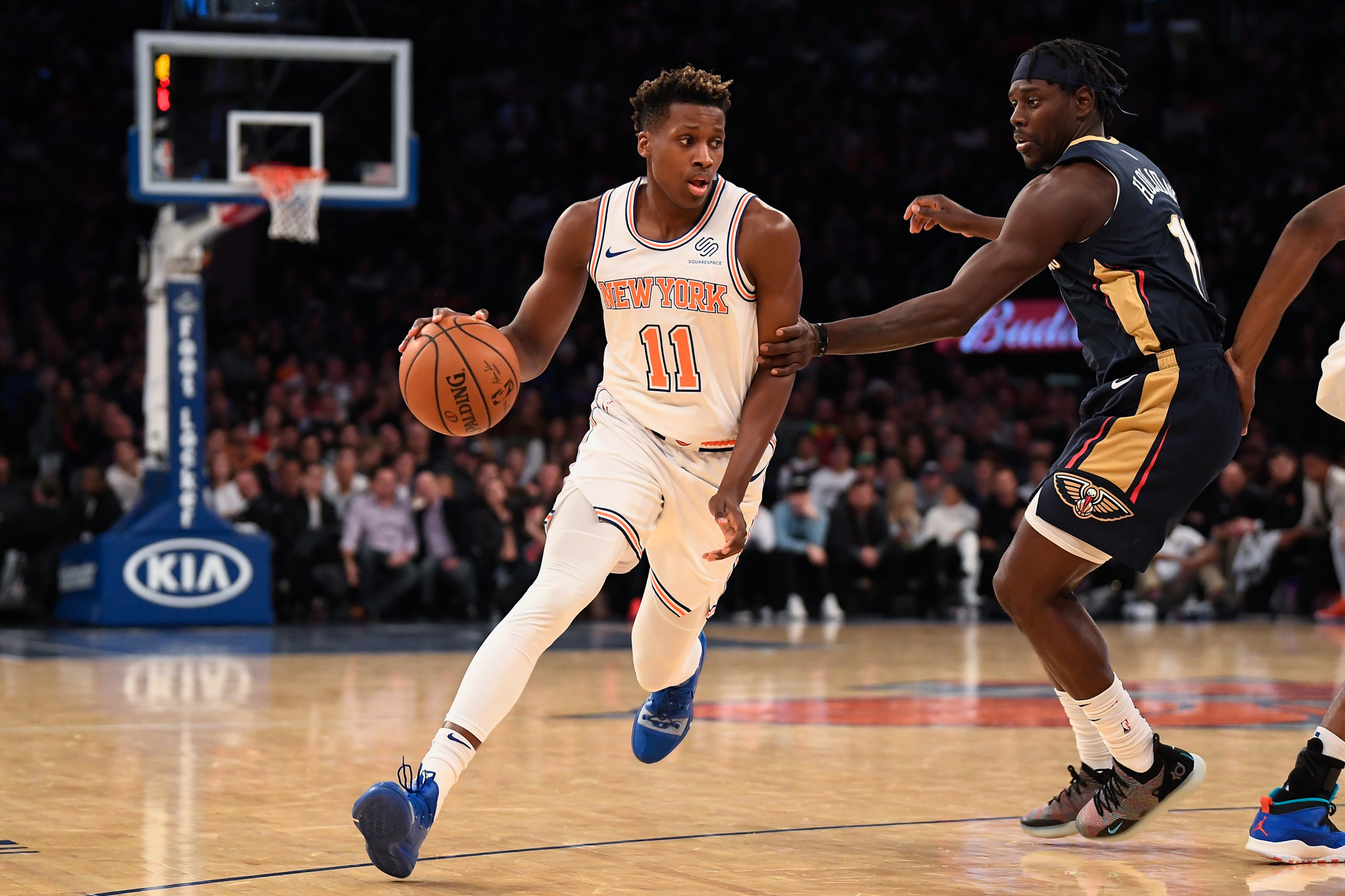 Nov 23, 2018; New York, NY, USA; New York Knicks guard Frank Ntilikina (11) drives the ball past the New Orleans Pelicans in the fourth quarter at Madison Square Garden. Mandatory Credit: Catalina Fragoso-USA TODAY Sports / Catalina Fragoso