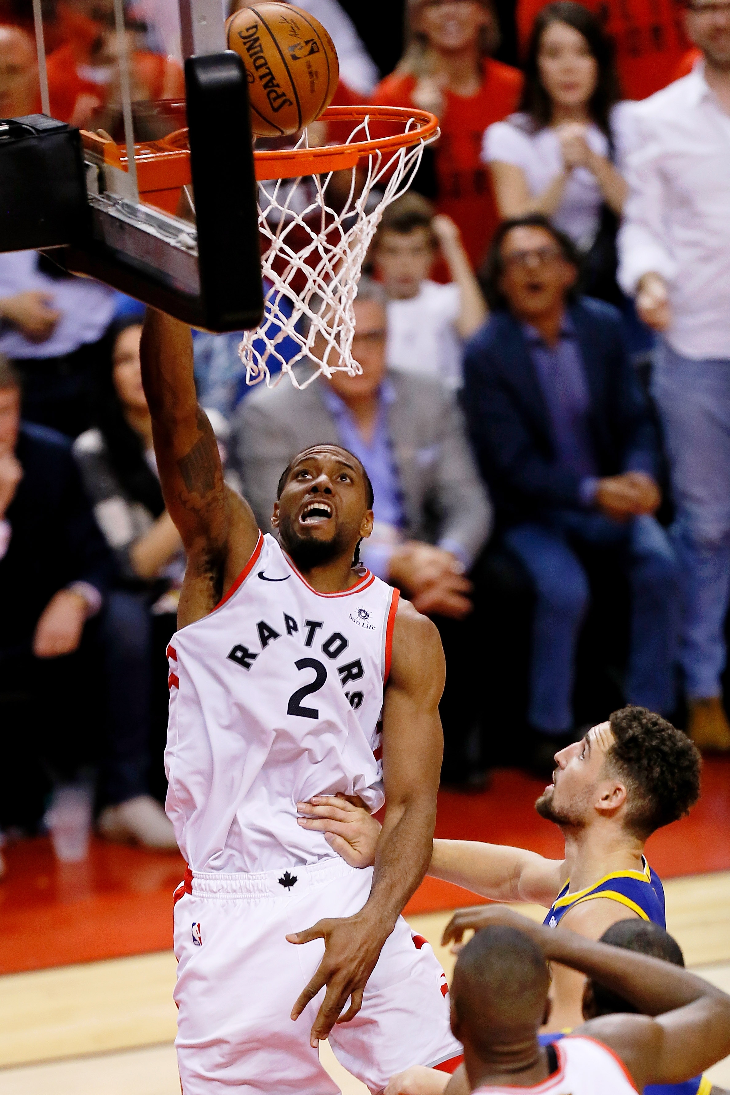 Toronto Raptors forward Kawhi Leonard shoots against the Golden State Warriors during the third quarter in Game 5 of the 2019 NBA Finals at Scotiabank Arena. / John E. Sokolowski/USA TODAY Sports