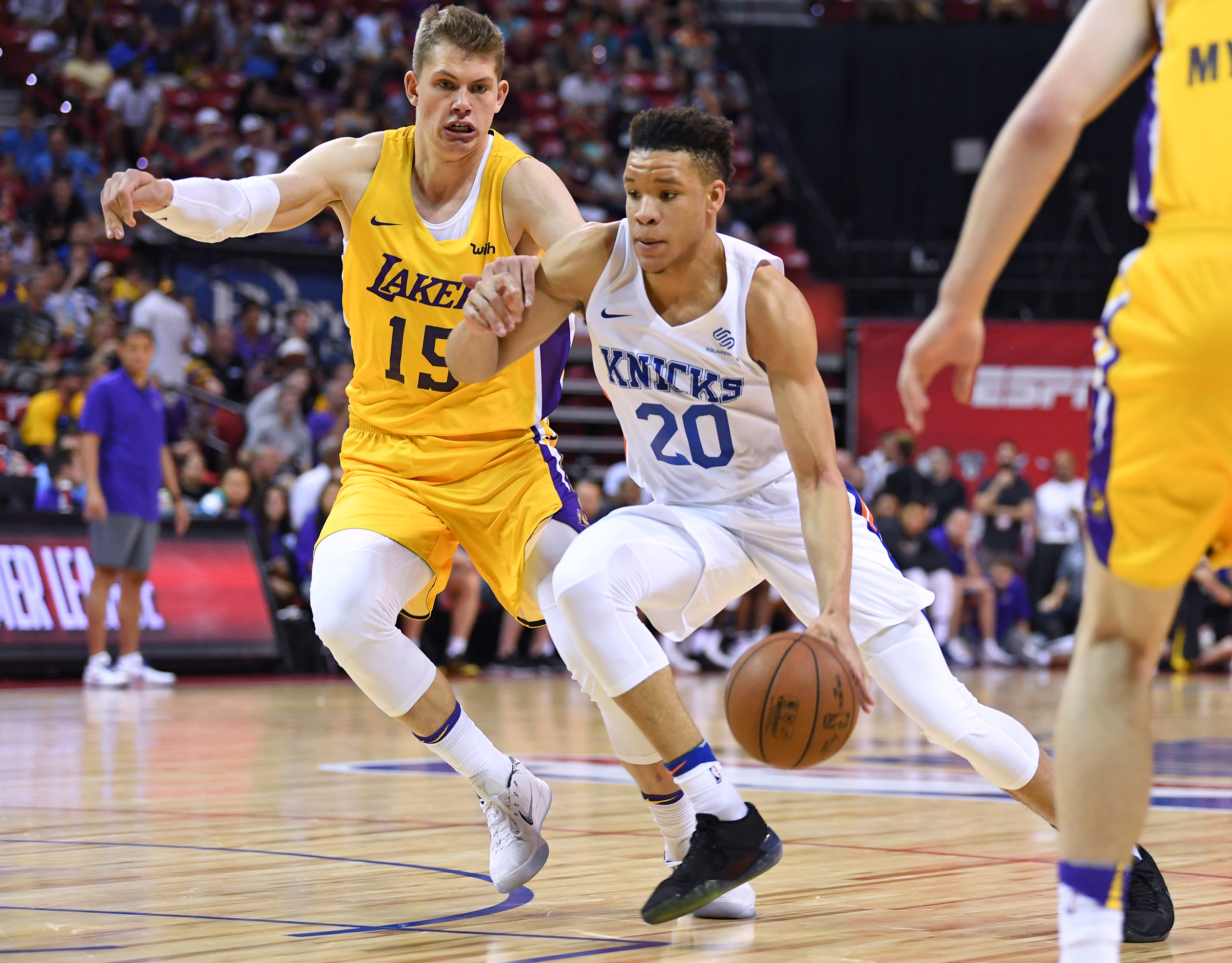 Jul 10, 2018; Las Vegas, NV, USA; New York Knicks forward Kevin Knox (20) dribbles inside Los Angeles Lakers center Moritz Wagner (15) during the first half at Thomas & Mack Center. Mandatory Credit: Stephen R. Sylvanie-USA TODAY Sports / Stephen R. Sylvanie