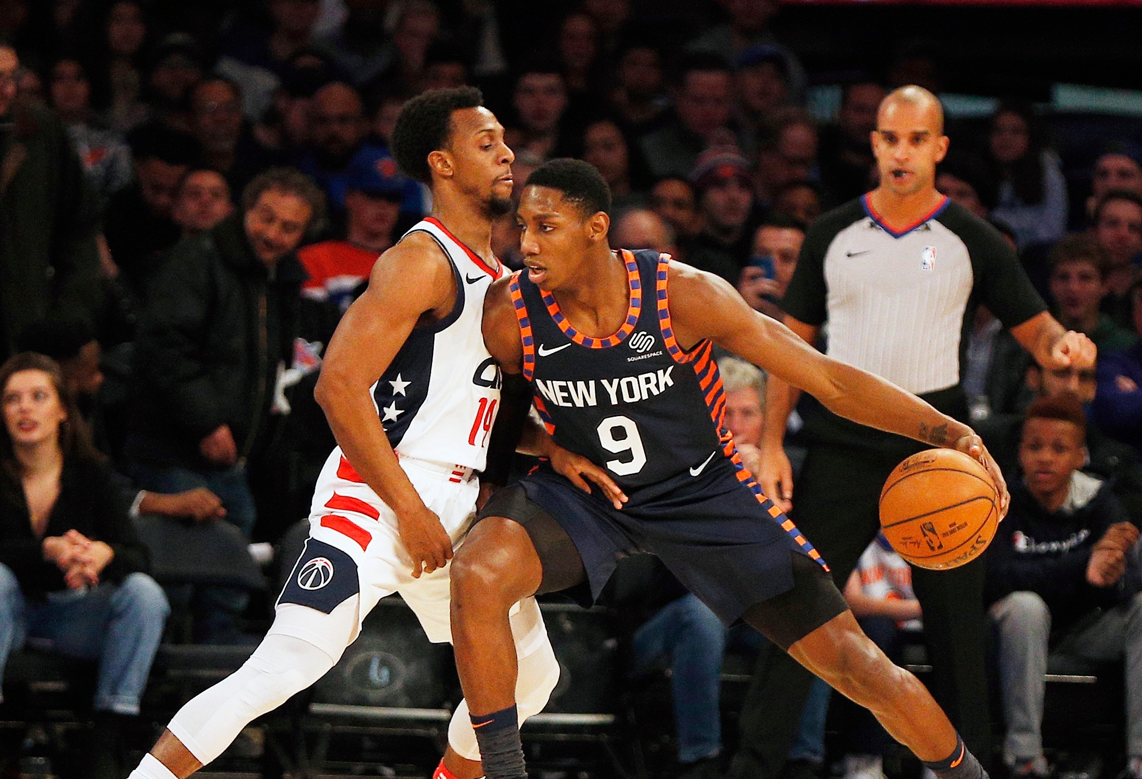 Dec 23, 2019; New York, New York, USA; New York Knicks forward RJ Barrett (9) dribbles the ball against Washington Wizards guard Ish Smith (14) during the first half at Madison Square Garden. Mandatory Credit: Andy Marlin-USA TODAY Sports / Andy Marlin