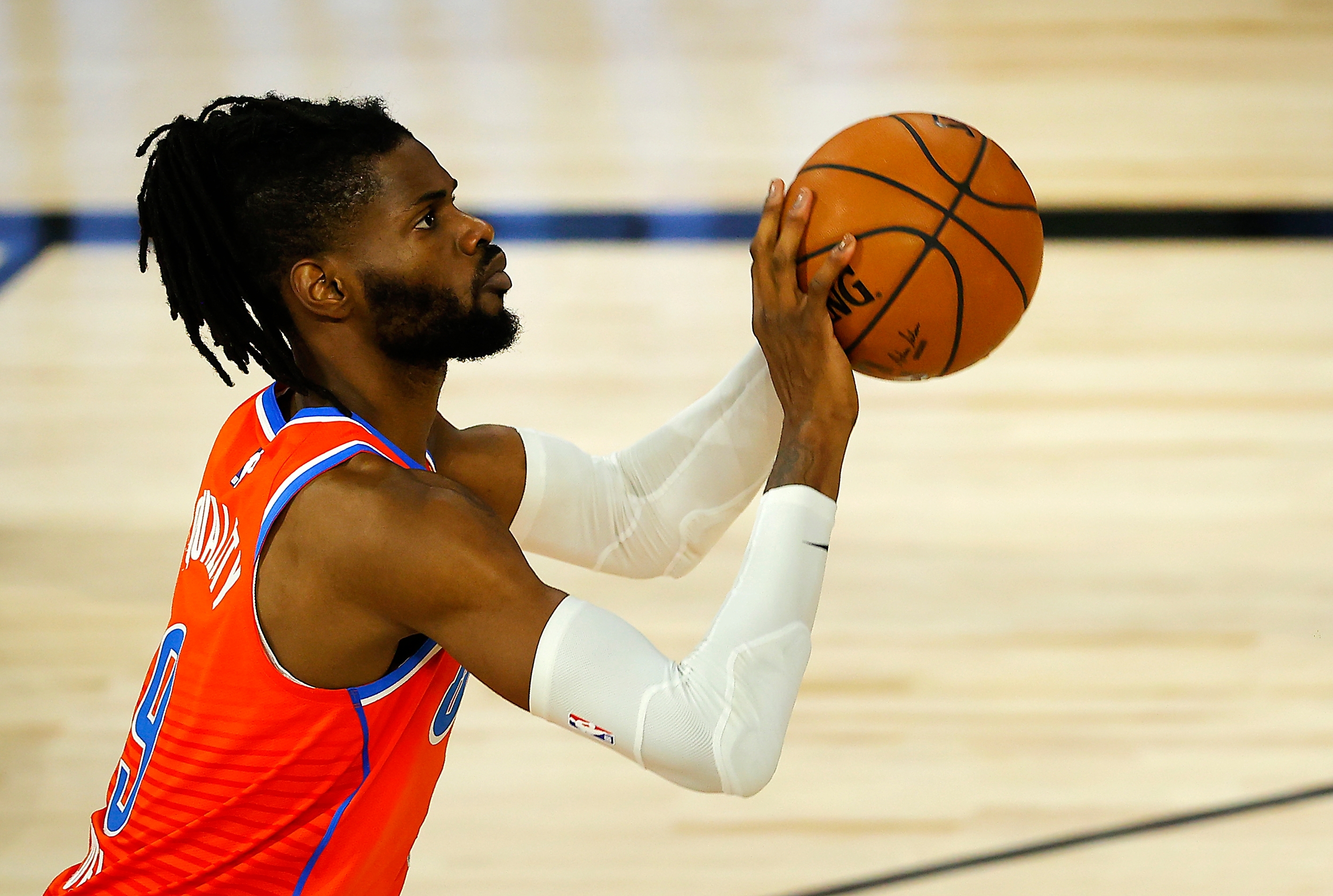 Aug 14, 2020; Lake Buena Vista, Florida, USA; Nerlens Noel #9 of the Oklahoma City Thunder shoots the ball during the first quarter against the LA Clippers at The Field House at ESPN Wide World of Sports Complex / Mike Ehrmann/Pool Photo-USA TODAY Sports