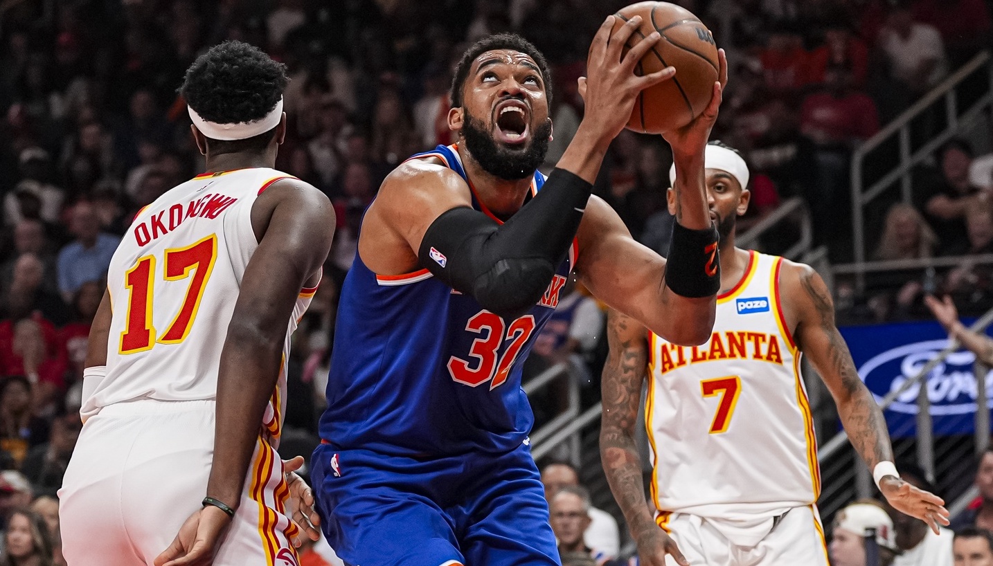 Knicks lean on Karl-Anthony Towns' triple-double to beat Hawks, 114-98, in Game 4OG Anunoby also recorded double-double as New York evens series4/26/2026, 1:01 AMRobert SanchezFreelance Editorial ProducerNew York Knicks center Karl-Anthony Towns (32) tries to reach the basket against Atlanta Hawks forward Onyeka Okongwu (17) during the first half at State Farm Arena. / Dale Zanine-Imagn Images