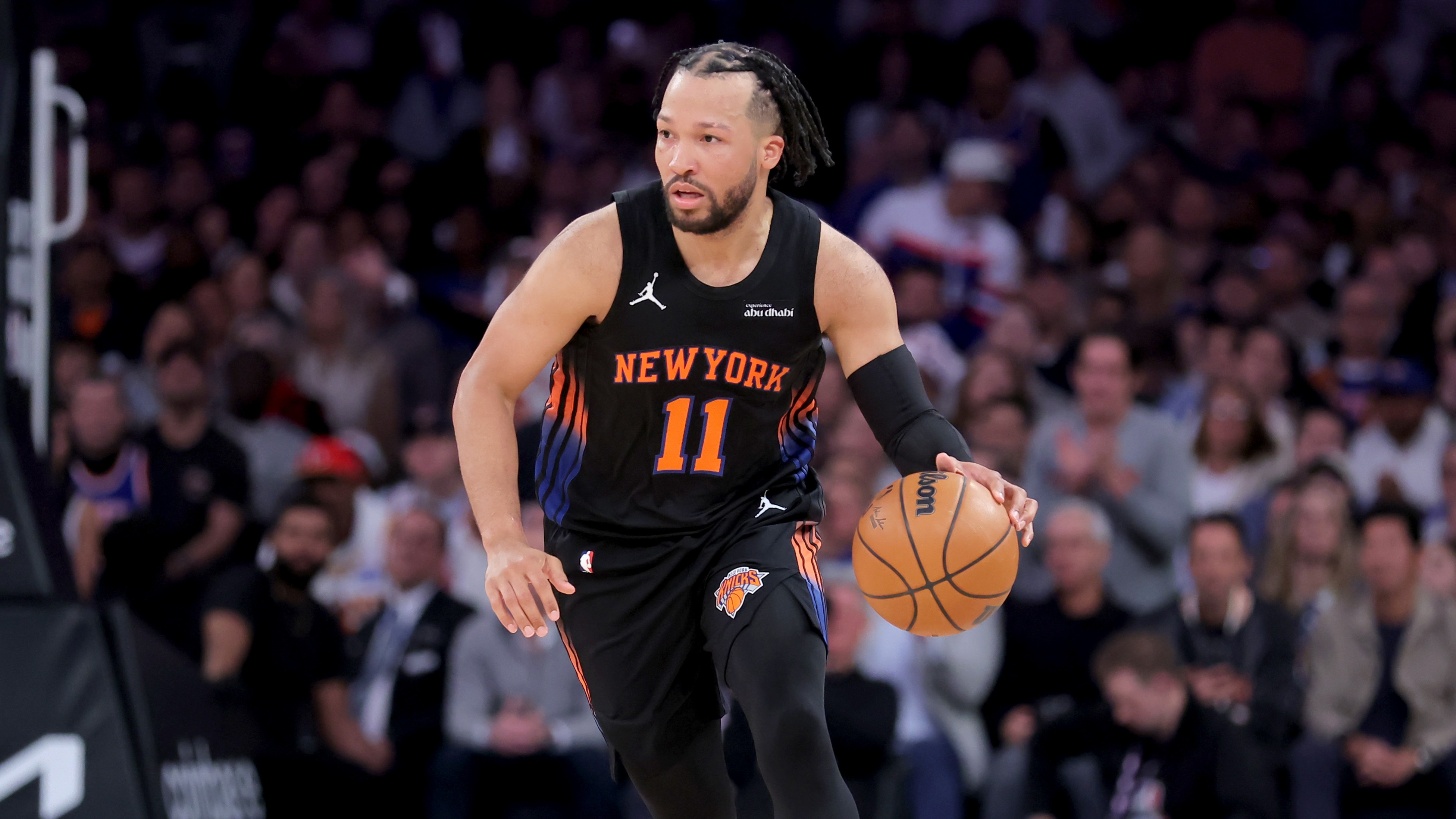 Apr 18, 2026; New York, New York, USA; New York Knicks center Karl-Anthony Towns (32) is guarded by Atlanta Hawks forward Onyeka Okongwu (17) during the first quarter of the 2026 NBA Playoffs at Madison Square Garden. / Vincent Carchietta-Imagn Images