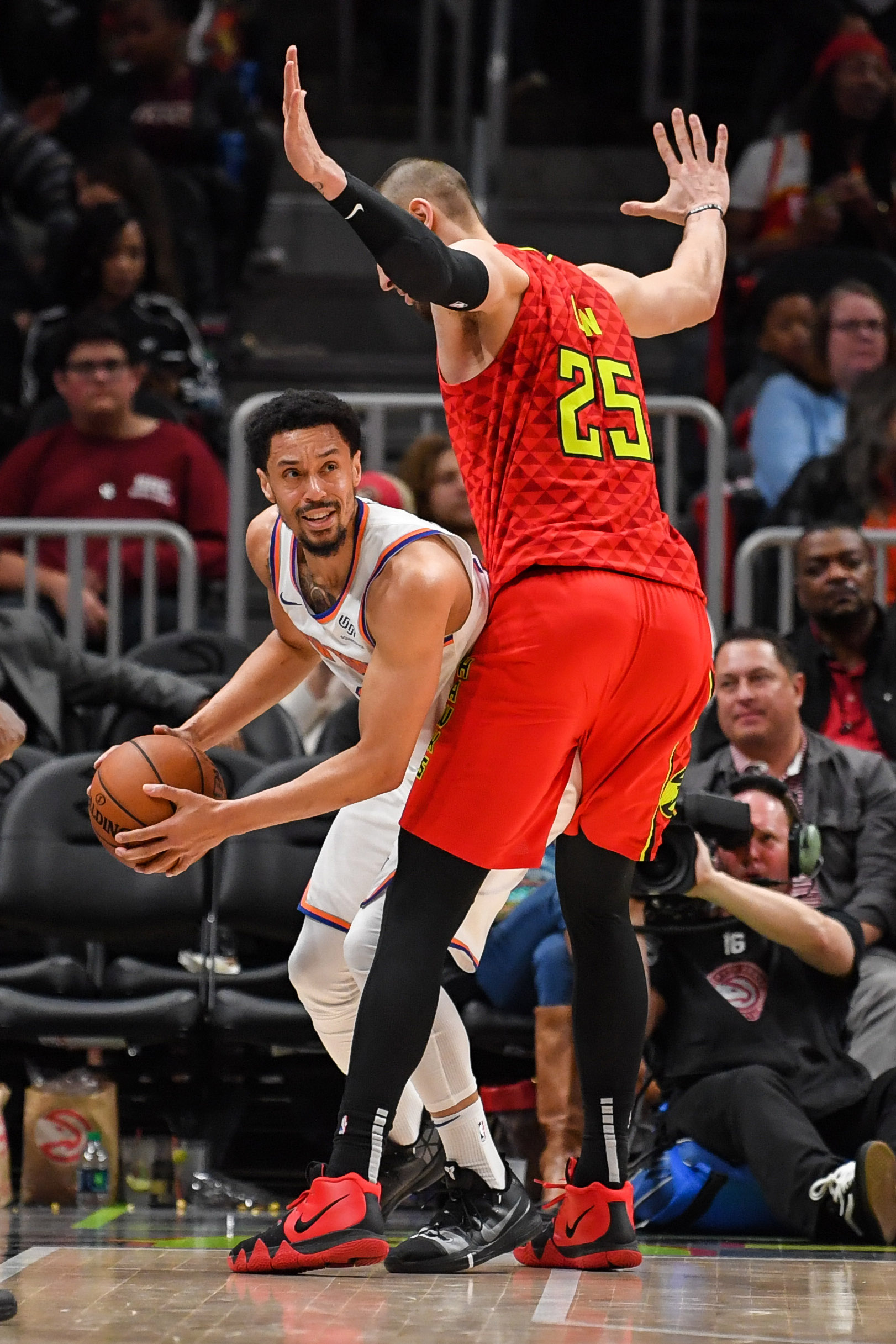 Feb 14, 2019; Atlanta, GA, USA; New York Knicks guard John Jenkins (30) is guarded by Atlanta Hawks center Alex Len (25) during the second half at State Farm Arena. Mandatory Credit: Dale Zanine-USA TODAY Sports / Dale Zanine