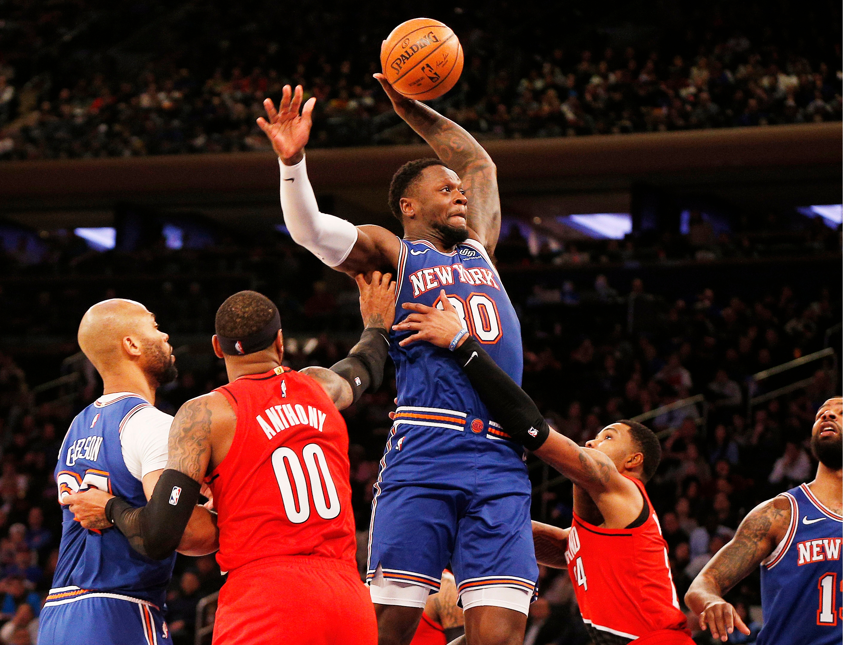 Jan 1, 2020; New York, New York, USA; New York Knicks forward Julius Randle (30) goes in for a shot against Portland Trail Blazers forward Carmelo Anthony (00) and guard Kent Bazemore (24) during the second half at Madison Square Garden. Mandatory Credit: Andy Marlin-USA TODAY Sports / Andy Marlin