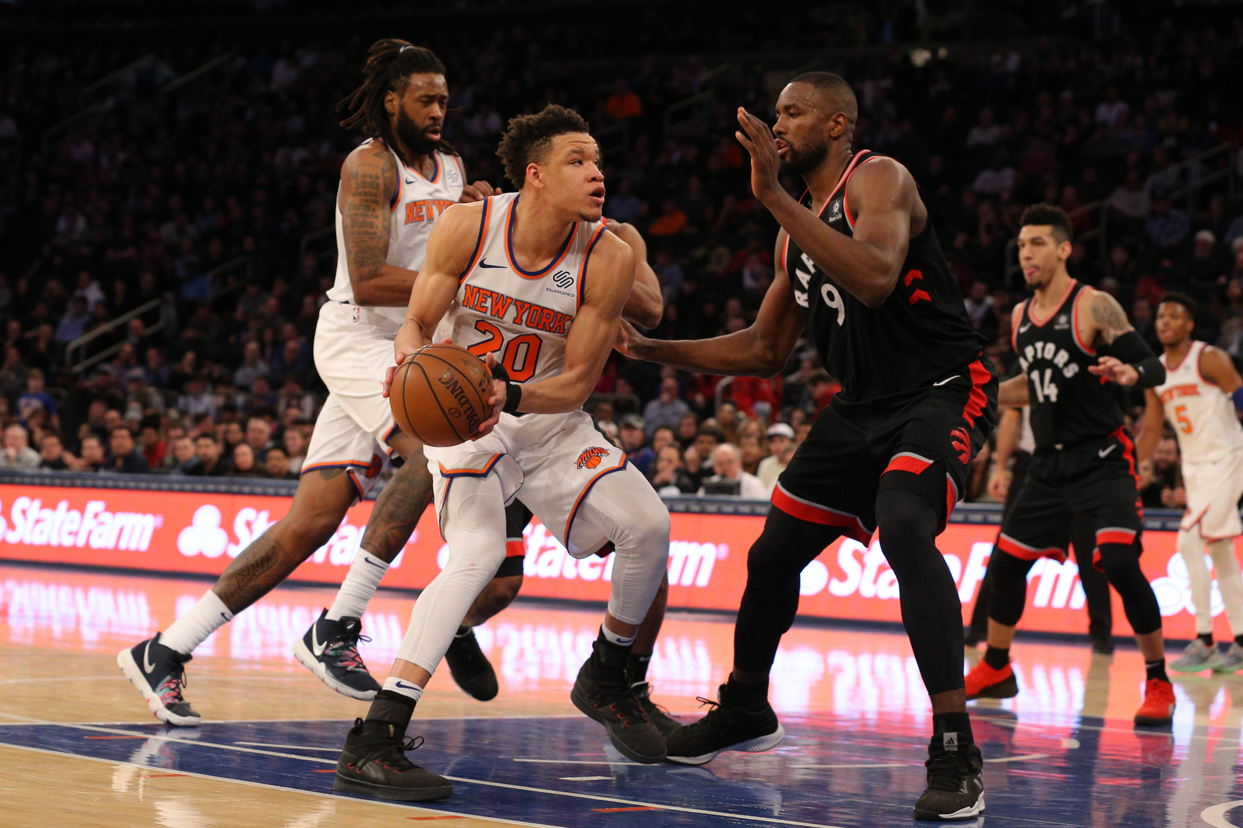 Feb 9, 2019; New York, NY, USA; New York Knicks forward Kevin Knox (20) drives to the basket against Toronto Raptors forward Serge Ibaka (9) during the fourth quarter at Madison Square Garden. Mandatory Credit: Brad Penner-USA TODAY Sports / Brad Penner