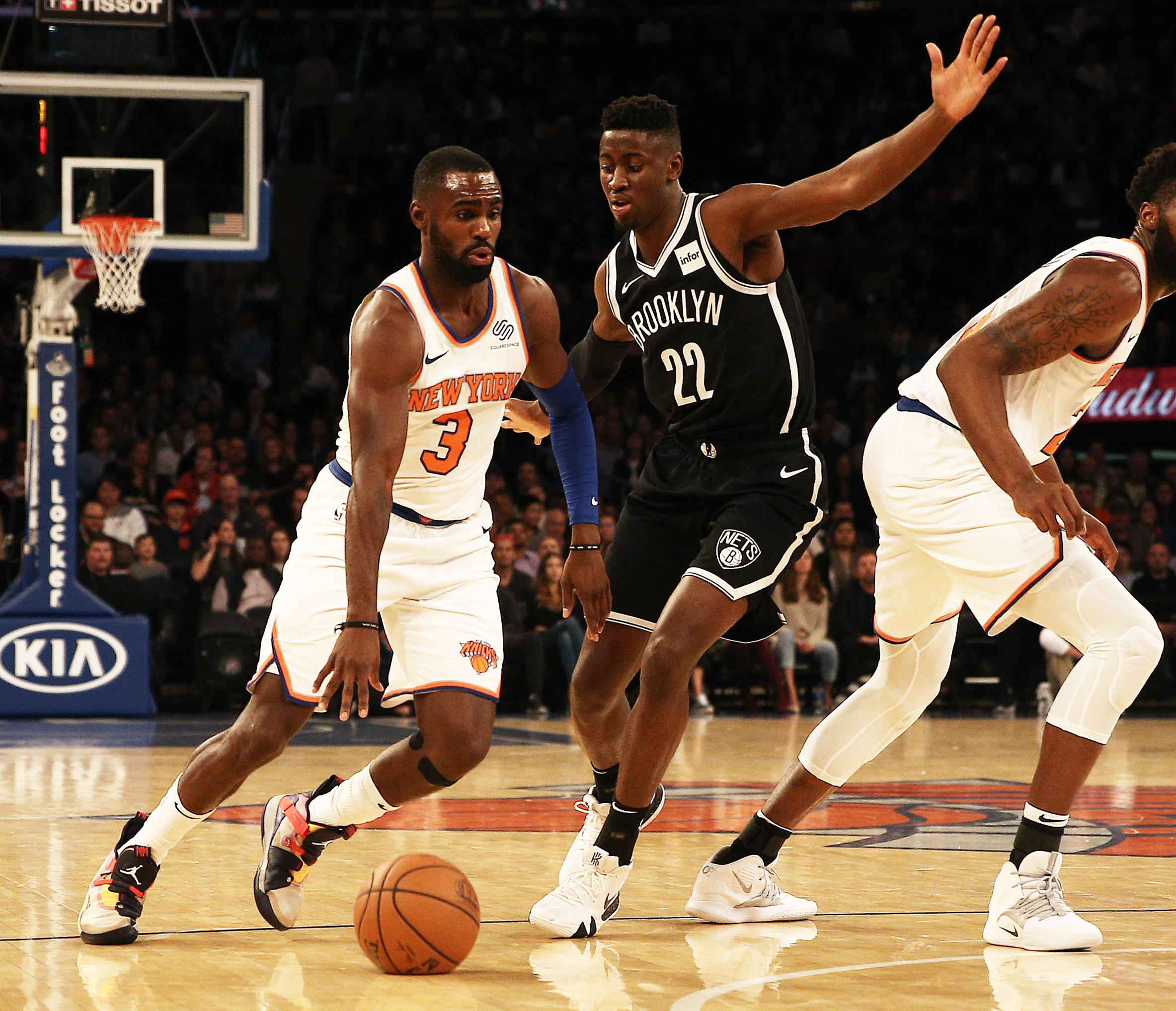 Oct 12, 2018; New York, NY, USA; New York Knicks guard Tim Hardaway Jr. (3) dribbles the ball while being defended by Brooklyn Nets guard Caris LeVert (22) during the first half at Madison Square Garden. Mandatory Credit: Andy Marlin-USA TODAY Sports / Andy Marlin