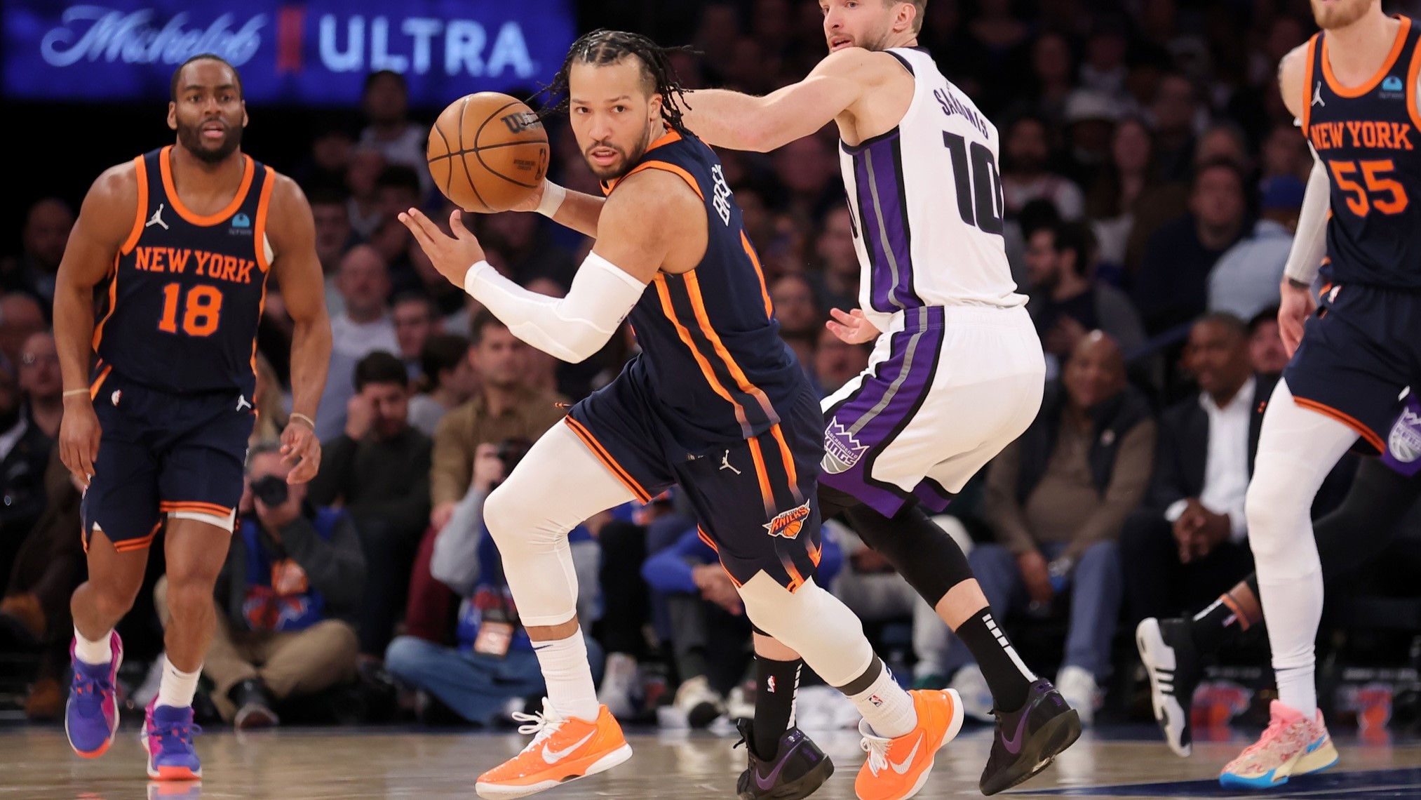 Apr 4, 2024; New York, New York, USA; New York Knicks guard Jalen Brunson (11) brings the ball up court after a steal against Sacramento Kings forward Domantas Sabonis (10) during the second quarter at Madison Square Garden. / Brad Penner-USA TODAY Sports