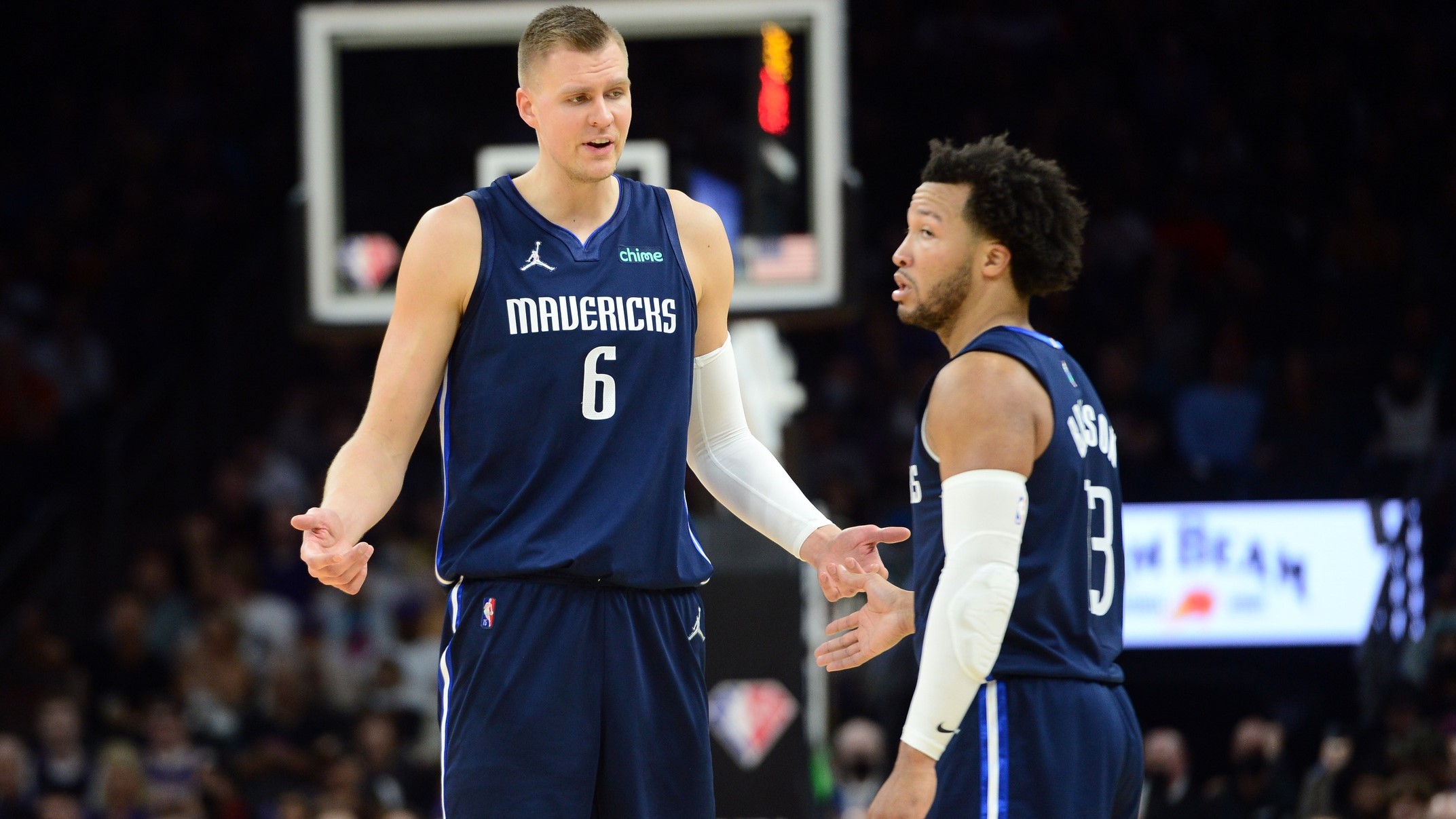 Dec 14, 2019; Dallas, TX, USA; Dallas Mavericks forward Kristaps Porzingis (6) consoles guard Jalen Brunson (13) after Brunson misses a shot to tie the game against the Miami Heat during overtime at the American Airlines Center. / Jerome Miron-USA TODAY Sports