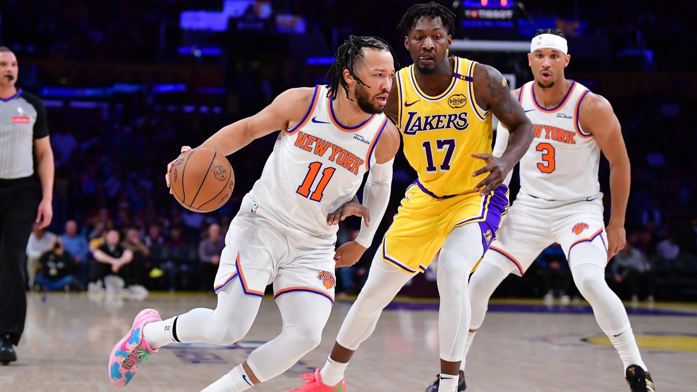 Jalen Brunson outscores Luka Doncic, LeBron James but leaves with apparent ankle injury in Knicks' 113-109 OT loss to LakersKnicks drop first contest of five-game West Coast trip3/7/2025, 6:10 AMPhillip MartinezEditorial ProducerMar 6, 2025; Los Angeles, California, USA; New York Knicks guard Jalen Brunson (11) moves the ball against Los Angeles Lakers forward Dorian Finney-Smith (17) during the first half at Crypto.com Arena. / Gary A. Vasquez-Imagn Images