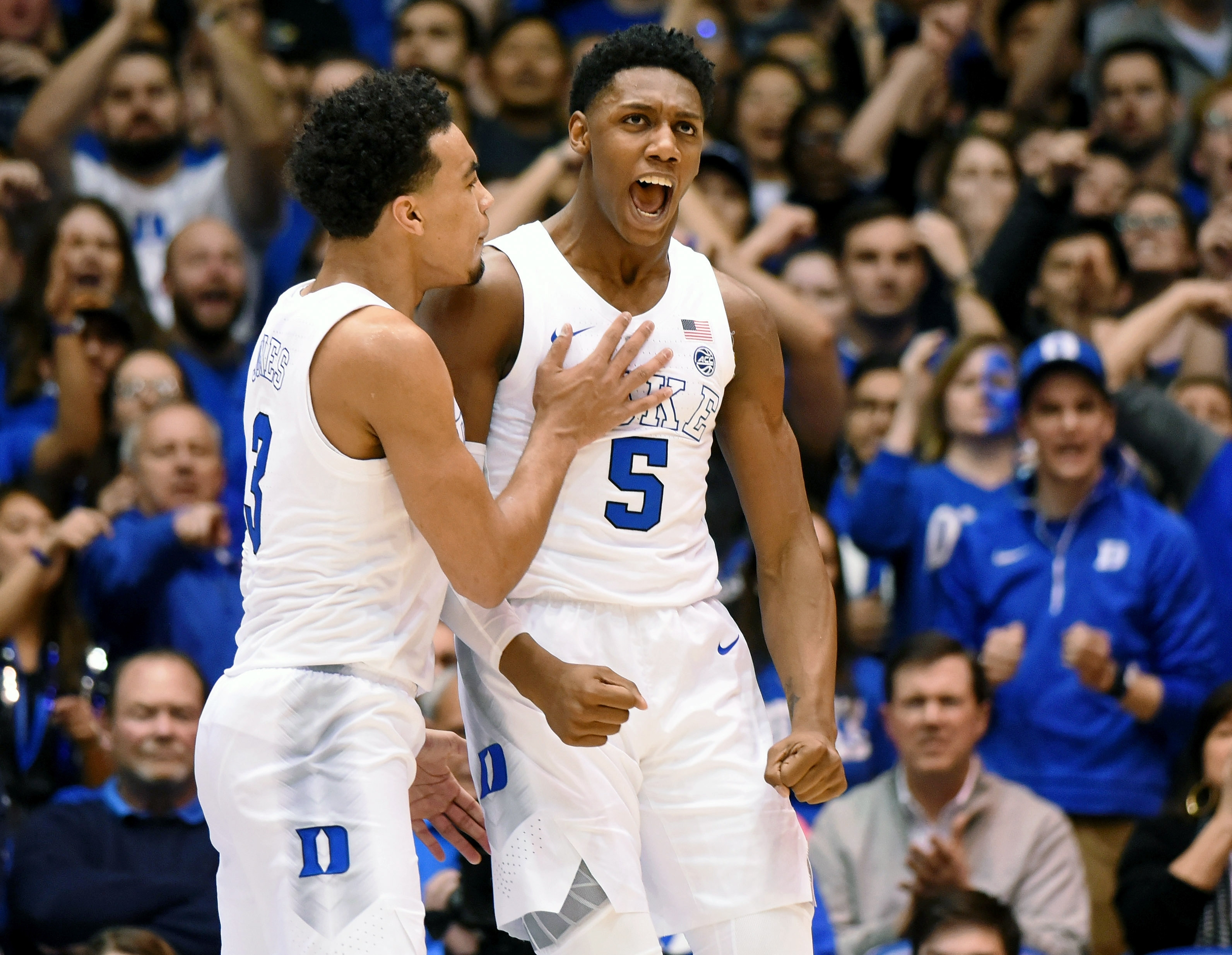 Duke Blue Devils forward R.J. Barrett reacts during the second half against the Wake Forest Demon Deacons at Cameron Indoor Stadium. / Rob Kinnan/USA TODAY Sports