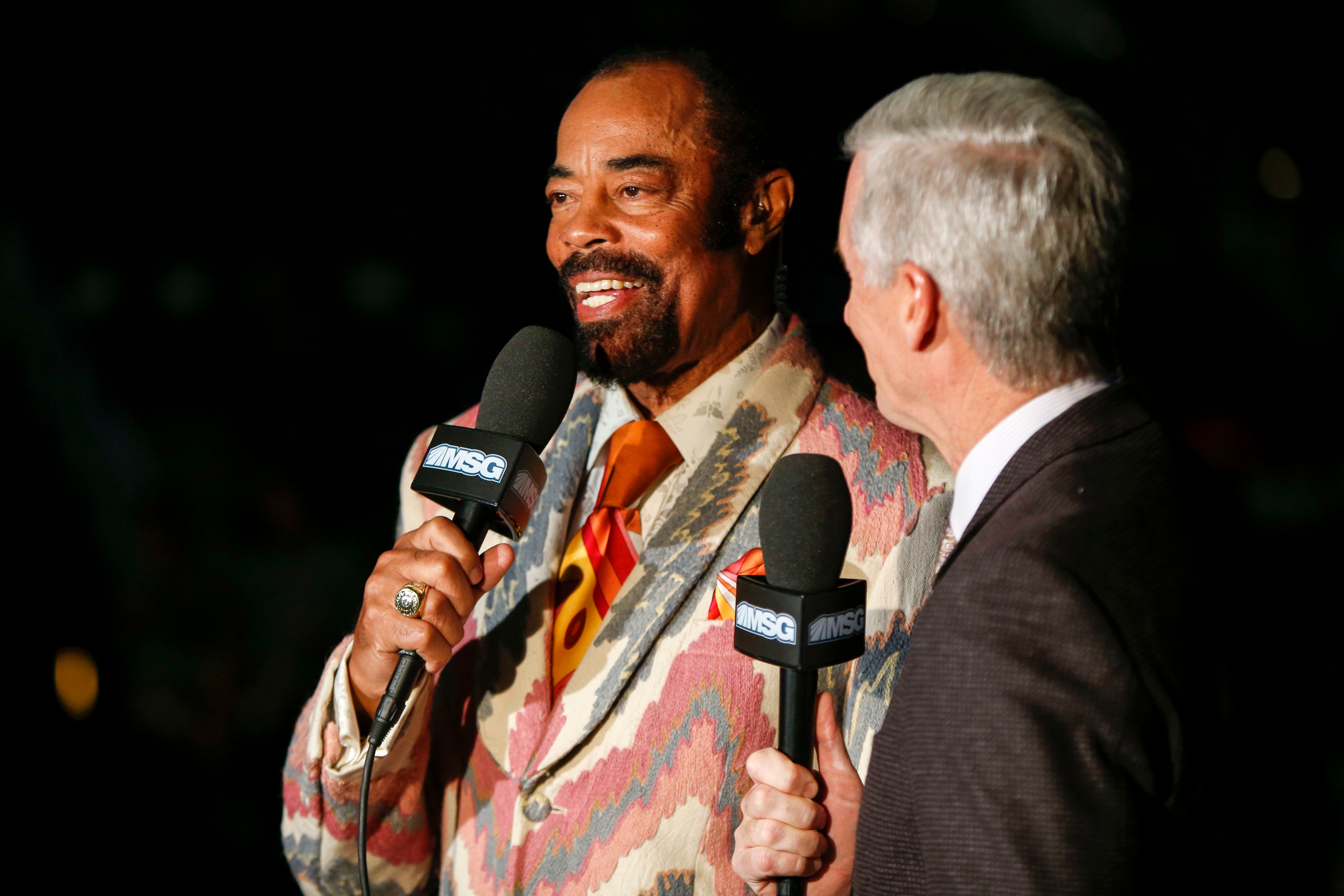 Nov 24, 2017; Atlanta, GA, USA; New York Knicks color commentator and former player Walt Frazier broadcasts prior to a game between the New York Knicks and the Atlanta Hawks at Philips Arena. Mandatory Credit: Brett Davis-USA TODAY Sports / Brett Davis