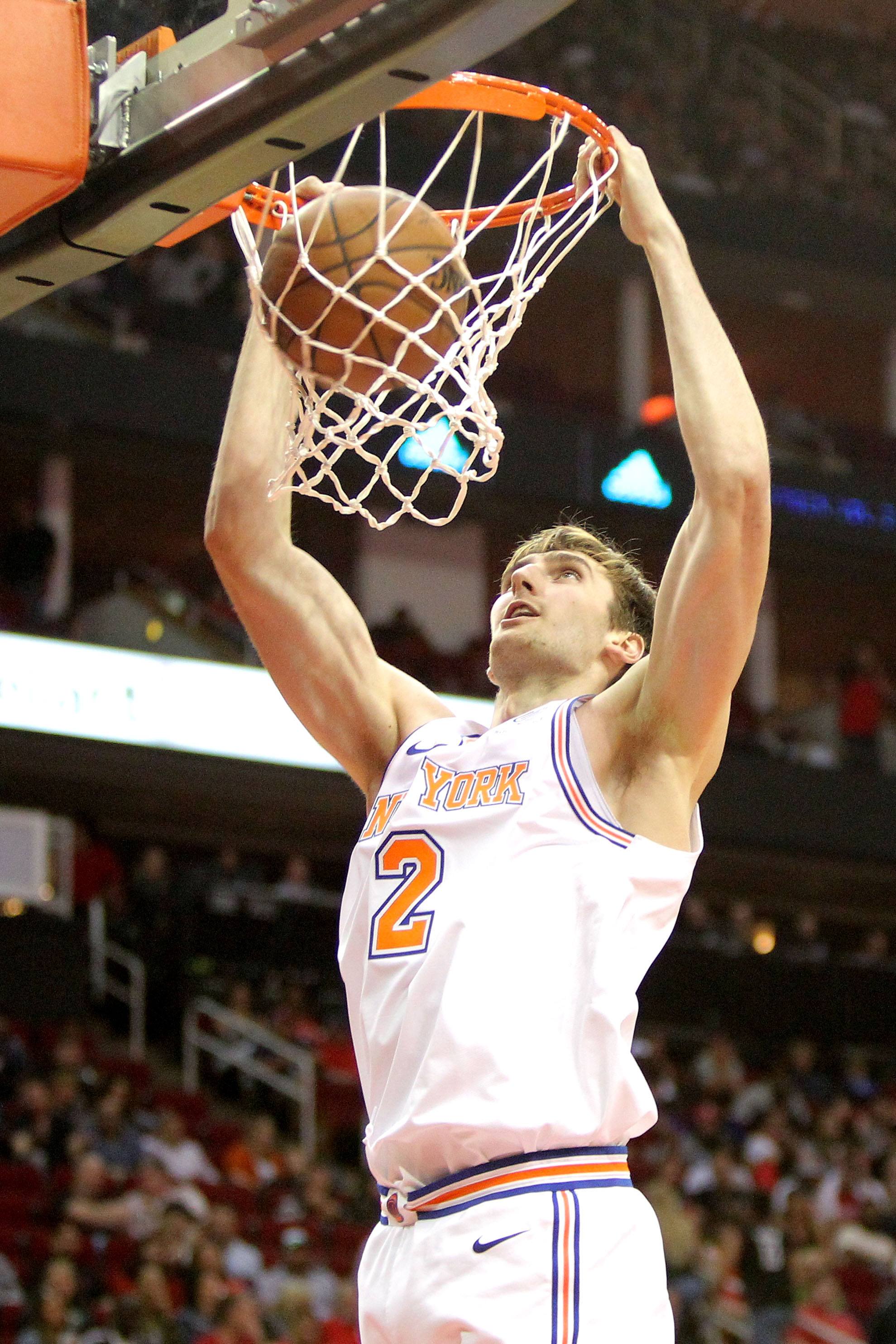 Apr 5, 2019; Houston, TX, USA; New York Knicks forward Luke Kornet (2) makes a slam dunk against the Houston Rockets during the fourth quarter at Toyota Center. Mandatory Credit: Erik Williams-USA TODAY Sports / Erik Williams