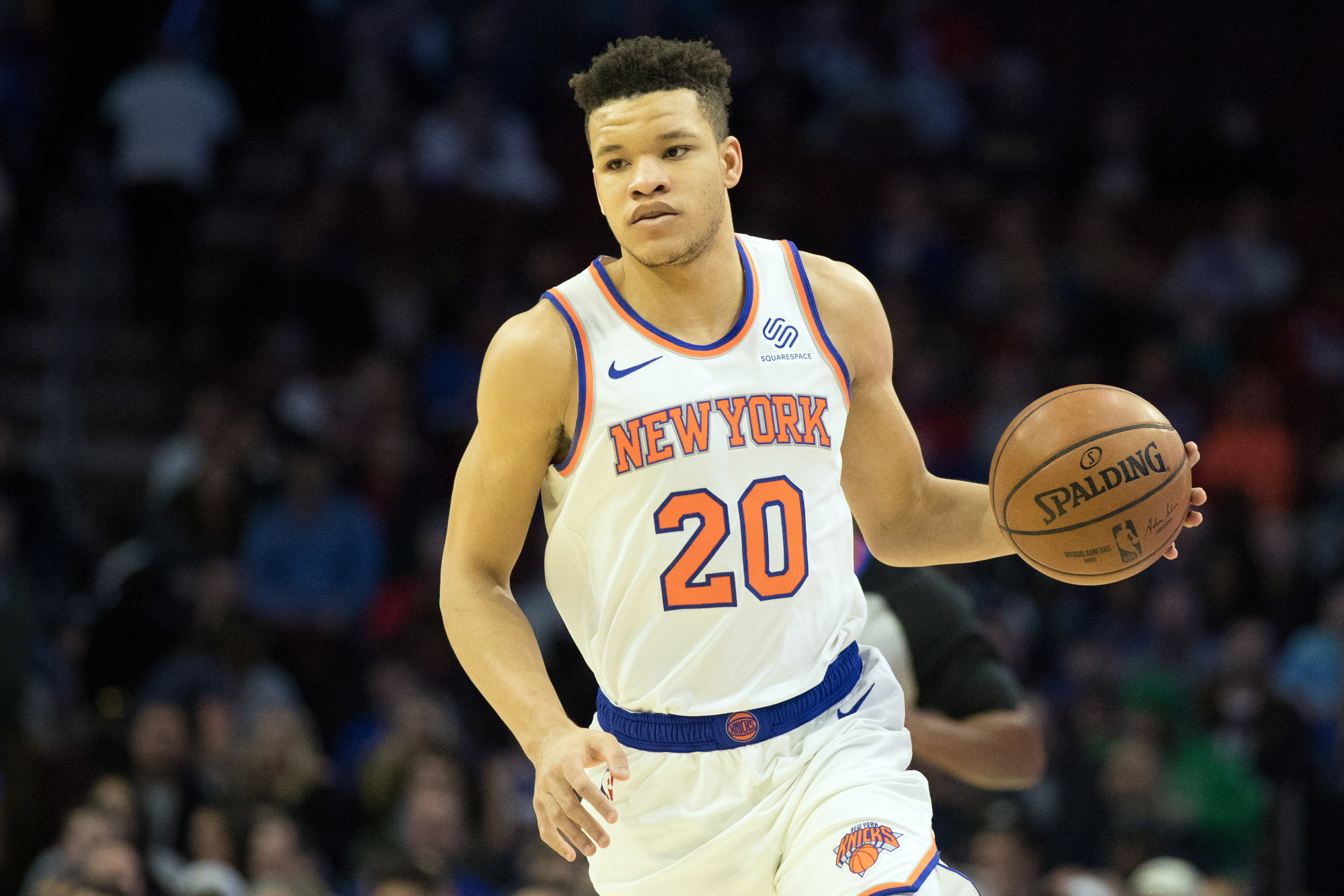 Dec 19, 2018; Philadelphia, PA, USA; New York Knicks forward Kevin Knox (20) dribbles against the Philadelphia 76ers during the first quarter at Wells Fargo Center. Mandatory Credit: Bill Streicher-USA TODAY Sports / Bill Streicher