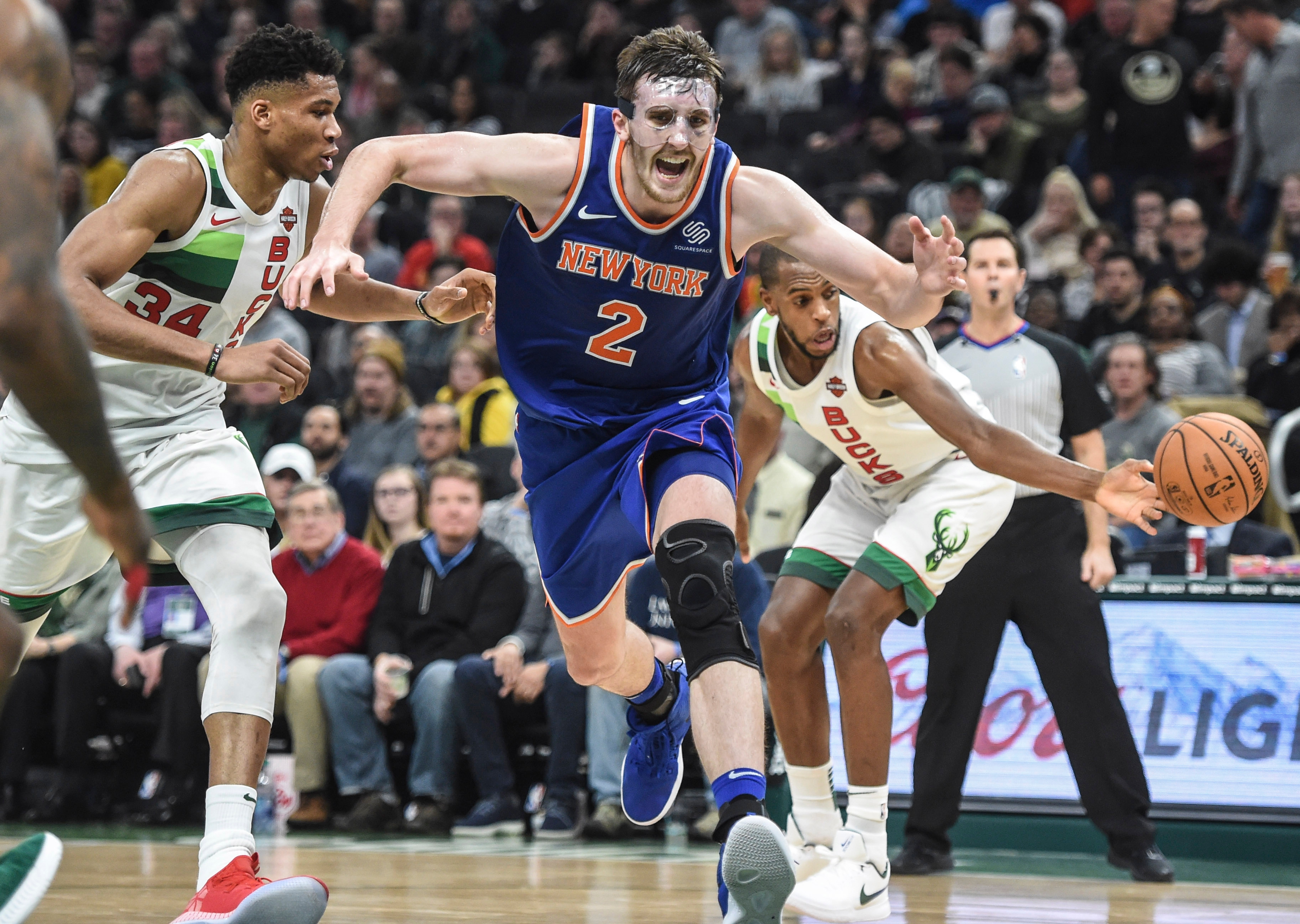 New York Knicks forward Luke Kornet attempts to control the ball as Milwaukee Bucks forward Giannis Antetokounmpo and forward Khris Middleton defend in the third quarter at the Fiserv Forum. / Benny Sieu/USA TODAY Sports