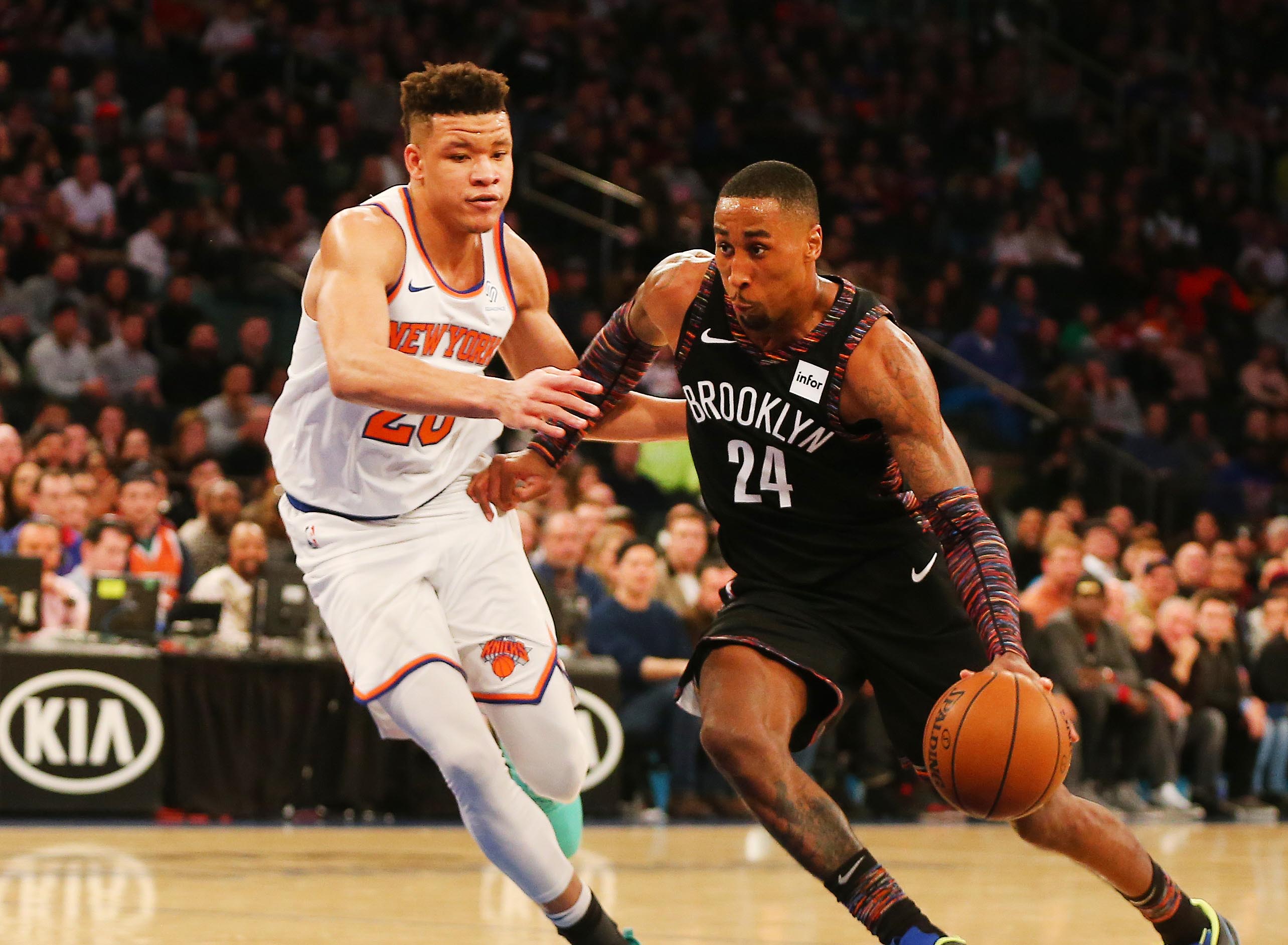 Dec 8, 2018; New York, NY, USA; Brooklyn Nets forward Rondae Hollis-Jefferson (24) dribbles the ball against New York Knicks forward Kevin Knox (20) during the second half at Madison Square Garden. Mandatory Credit: Andy Marlin-USA TODAY Sports / Andy Marlin