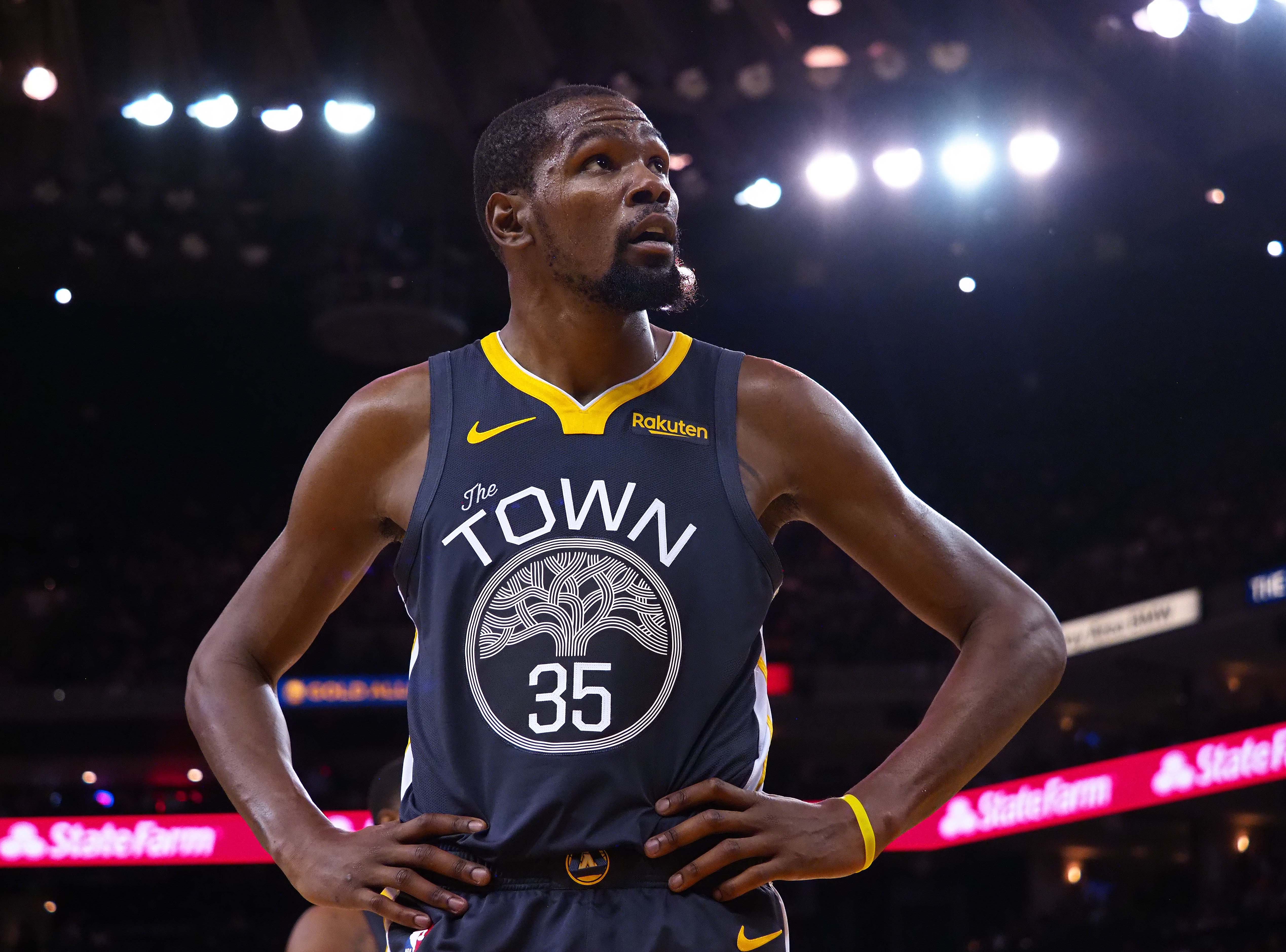 Golden State Warriors forward Kevin Durant between plays against the Portland Trail Blazers during the fourth quarter at Oracle Arena. / Kelley L Cox/USA TODAY Sports
